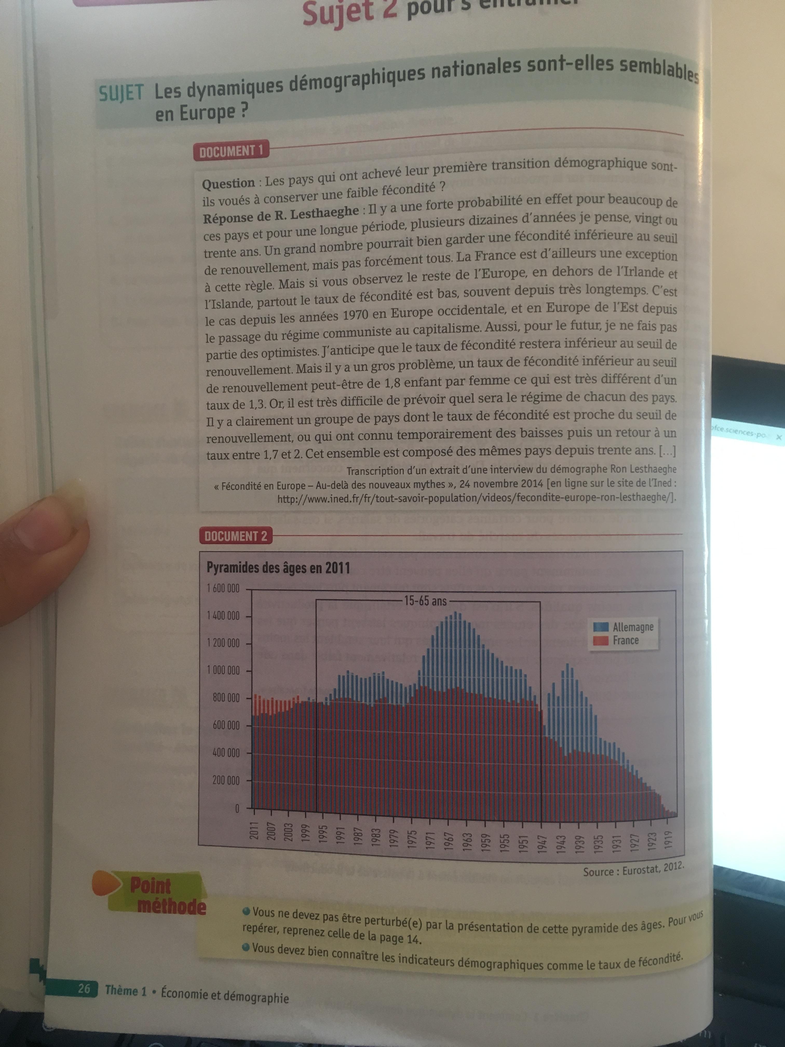 Nathaaaan345 Posté(e) le 9 novembre 2017 Signaler Posté(e) le 9 novembre 2017 Bonjour, j’ai un sujet en économie approndie à effectuer et j’aurais de votre aide s’il vous plaît. Ce devoir parle des dynamiques démographiques nationales en Europe. La problématique est la suivante: « Les dynamiques démographiques nationales sont-elles semblables en Europe? » Cette problématique est accompagnée de deux document que je vous joins ci-dessous. J’ai commencer par analyser les documents et j’en ai tirer le maximum d’informations pour pouvoir faire mon plan: I: Un taux de fécondité similaire II: Un grand écart démographique Voila où j’en suis de mon travail, je ne suis pas sûr de mon plan et de ce qu’il faut expliciter dans les différentes parties. J’aurais besoin de quelques pistes de travail afin d’essayer de comprendre les documents et réaliser ce sujet correctement.