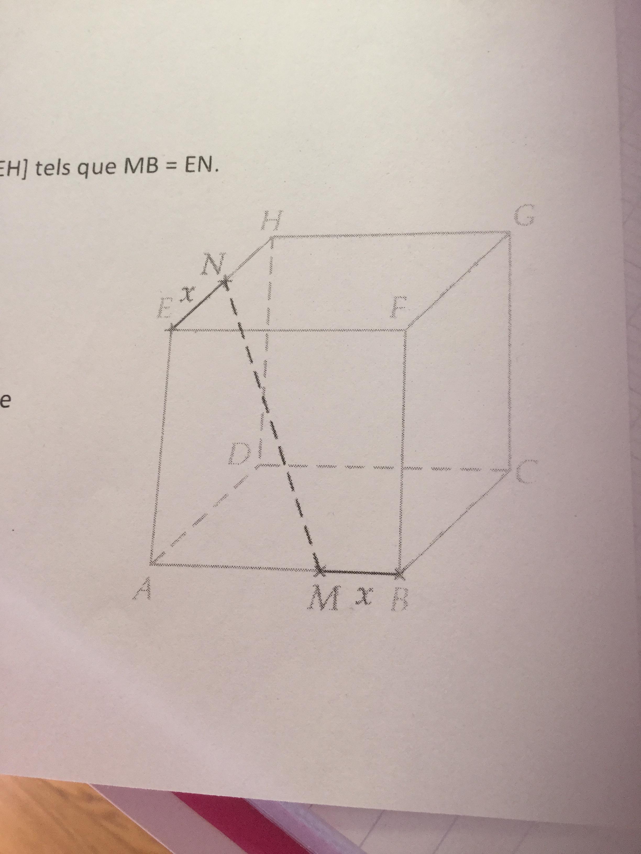 lila225767 Posté(e) le 19 novembre 2017 Signaler Posté(e) le 19 novembre 2017 Bonjour, je suis en 1S et j'ai un dm à faire pour lundi, je sais que je m'y prends un peu tard mais je ne comprends pas deux exercices..!!! pouvez-vous m'aider s'il vous plaît ? Exercice 1 : Sur une droite graduée D, on note A, B et M les points d'abscisses respectives : 3, -2, x. On cherche s'il existe une position de M sur D rendant minimal le nombre 2 MA + MB. Montrer que résoudre ce problème revient à étudier le minimum de la fonction f définie sur R par f(x) = 2 |x-3| + |x+2|. A l'aide d'un tableau, écrire la fonction f sans valeur absolue (on distinguera 3 intervalles). Tracer la représentation graphique de la fonction f, et conclure grâce au graphique. Où j'en suis : ça va paraître bête mais comme je n'ai absolument pas compris la première question, j'ai fais exactement que la même manière qu'en cours : |x-3| = 1) x-3 si x 3 ; 2) -x+3 sinon. |x+2| = 1) x+2 si x -2 ; 2) -x-2 sinon. Mon tableau est joint. Je n'ai pas encore tracé la représentation graphique. Exercice 2 : ABCDEFGH est un cube de côté 4. M est le point de l'arête [AB] et N est le point de l'arête [EH] tels que MB = EN. On pose x = MB = EN. On considère la fonction f qui a x associe f(x) = MN. Quel est l'ensemble de définition de f ? J'ai trouvé x appartient à [0;4]. Exprimer f(x) en fonction de x (on pourra admettre que le triangle EMN est rectangle en E). J'ai d'abord pensé à calculer EM et j'ai trouvé EM^2 = -x^2 + 32, mais après je ne sais pas comment calculer MN, je bloque, je sais qu'il faut utiliser pythagore. Étudier le sens de variation de f, (on pourra admettre que f(x) = racine de 2x^2-8x+32) Déterminer la valeur de x pour laquelle la distance MN est minimale. Calculer la valeur de ce minimum.