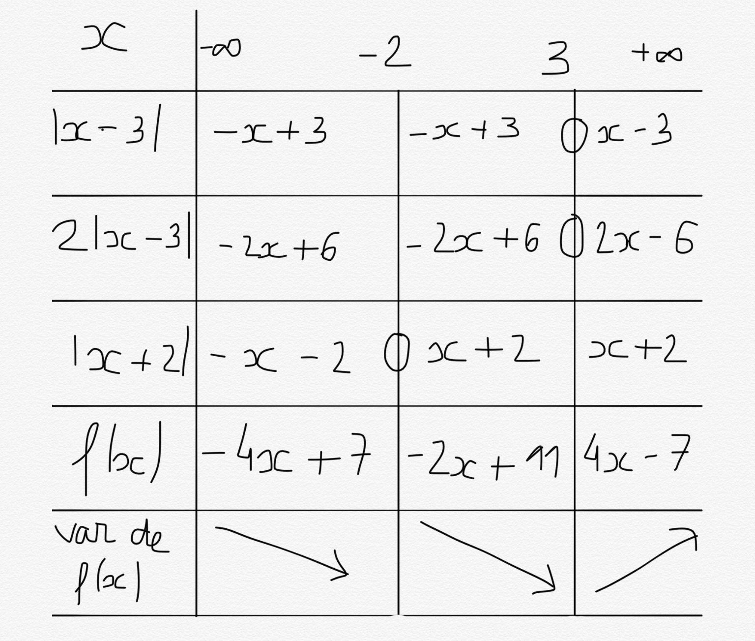 lila225767 Posté(e) le 19 novembre 2017 Auteur Signaler Posté(e) le 19 novembre 2017 Pour la 1), je ne comprend pas désolée... Pour la 3), j'ai tracé ça mais je ne sais pas quoi faire après il y a 4 minutes, Boltzmann_Solver a dit : Bonjour, Ex 1. Pour la 1), il te suffit d'exprimer les différentes distances. Puis d'exprimer la fonction f à partir de là. Pour la 2), fais plutôt un tableau de signes pour mettre en évidence les différents cas possibles. Mais pourquoi pas. Pour la 3) tu as besoin de la 2). il y a 3 minutes, PAVE a dit : Bonjour, A l'avenir astreins toi à ne mettre qu'un seul exercice par message. Pour le premier, je trouve plutôt judicieux que bête, le fait d'avoir "faisT exactement que la même manière qu'en cours". Pour la partie que vous ne comprenez pas, j'ai additionné les deux lignes au dessus car f(x) = 2 |x-3| + |x+2|