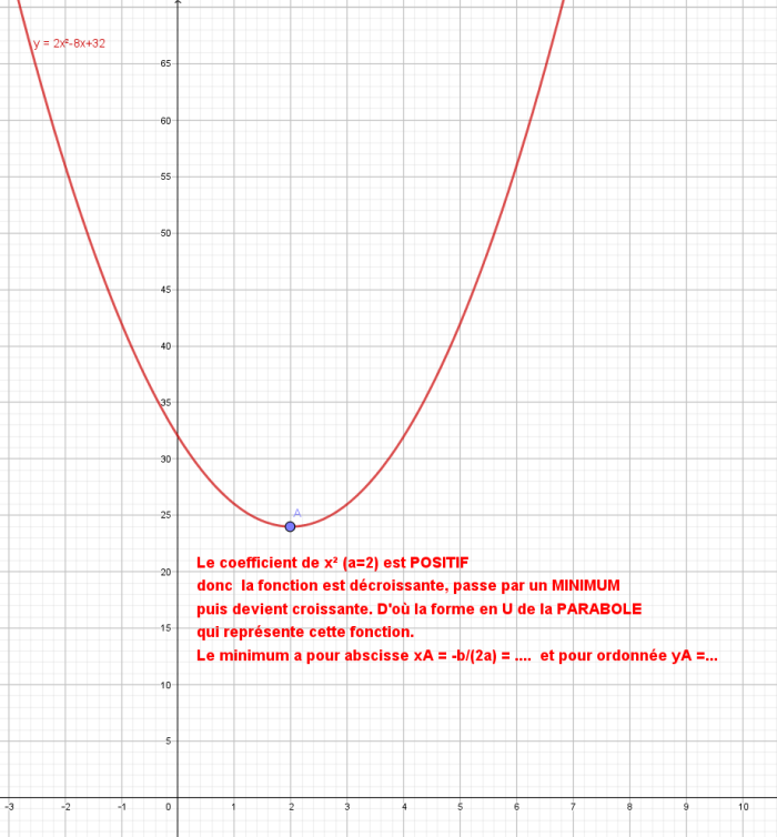 E-Bahut PAVE Posté(e) le 19 novembre 2017 E-Bahut Signaler Posté(e) le 19 novembre 2017 N'as tu pas vu "ma" parabole ? http://www.e-bahut.com/uploads/monthly_2017_11/5a11f218ed152_EBparabole01.thumb.png.66ca1f60d80cf91ef6388b47f76d485d.png En Seconde, on a du te dire que le minimum A (ou le maximum) de la parabole avait pour abscisse x = -b/(2a) (comme indiqué sur la figure ci dessus).