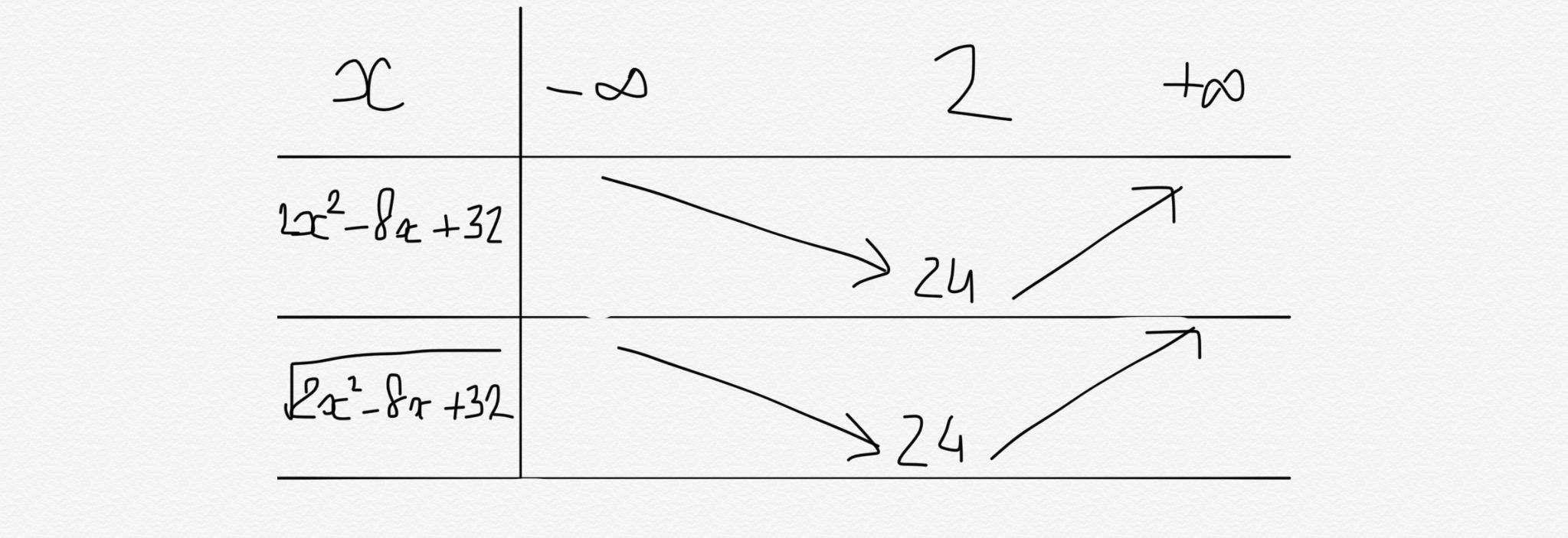 lila225767 Posté(e) le 20 novembre 2017 Auteur Signaler Posté(e) le 20 novembre 2017 Il y a 8 heures, PAVE a dit : ax²+bx+c 2x²-8x+32 donc -b/(2a) = 8/4 = 2 Il est trop tard pour continuer (au moins pour moi ) Bonne nuit. Bonjour Mon tableau est-il bon?
