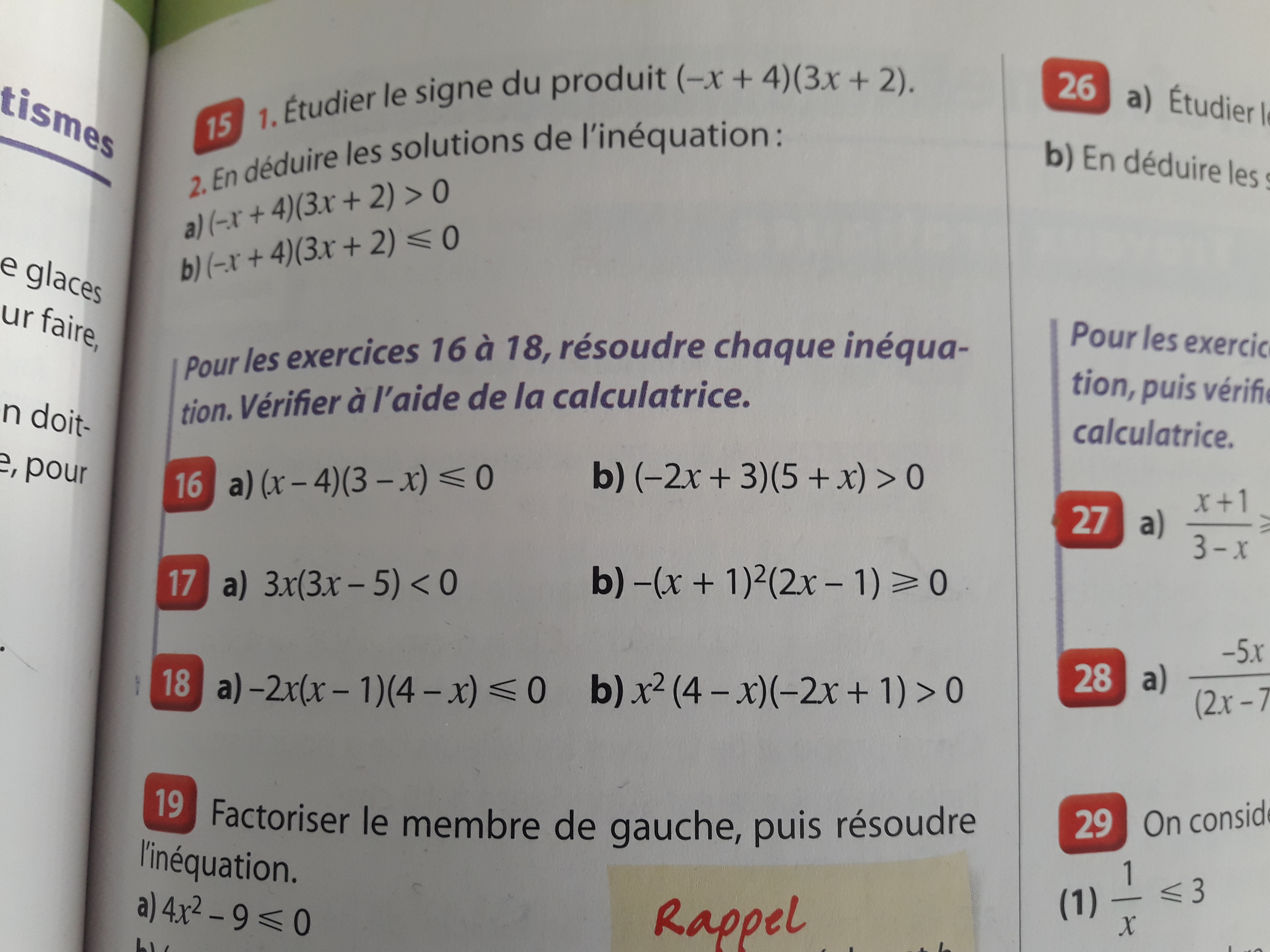 E-Bahut PAVE Posté(e) le 22 novembre 2017 E-Bahut Signaler Posté(e) le 22 novembre 2017 Bonjour Dan, Si tu lis l'énoncé de l'exercice 15 qui précède, tu as la méthode à suivre (et à mémoriser car elle sert souvent !) Pour résoudre une inéquation de ce type : un PRODUIT de facteurs dans le premier membre et ZERO dans le second membre, il faut (en Seconde tu n'as pas vraiment le choix) : a) étudier le SIGNE de l'expression qui est dans le 1er membre (ici l'expression étant un PRODUIT, il faut étudier successivement le signe de chaque FACTEUR) b) à partir du tableau de signes obtenu, voir pour quelles valeurs de x cette expression est par exemple NEGATIVE (si 0) ou POSITIVE (si 0) c) écrire l'ensemble des solutions trouvées S = ? Je viens de voir que Pzorba t'a fourni des indications qui complètent les miennes. A toi maintenant d'exploiter tout cela et de nous montrer (si tu le souhaites) ce que tu obtiens... pour félicitations ou corrections éventuelles !!