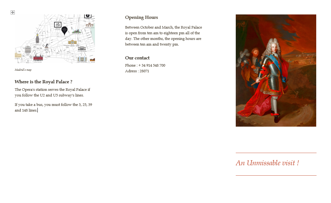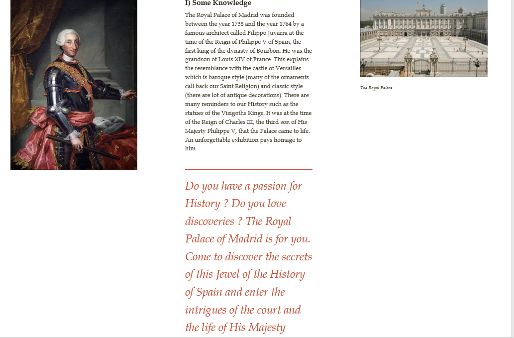Bourbon Posté(e) le 29 novembre 2017 Signaler Posté(e) le 29 novembre 2017 Bonjour, J'aimerais avoir une correction de mon travail : je dois réaliser une brochure publicitaire dans laquelle il faut convaincre le touriste de se rendre dans le lieu dont nous faisons la promotion. Merci. You have a passion for the History ? You love the discoveries ? The Palace Royal of Madrid is for you. Let's come to discover the secrets of this Jewel of the History of Spain and let's enter in the intrigues of the court and in the life of This Majesty Charles III. I) Some Knowledge : The Palace Royal of Madrid was founded between the year 1738 and the year 1764 by a famous architect called Filippo Juvarra at the time of the Reign of Philippe V of Spain, the first king of the dynasty of Bourbon. He is the grandson of Louis XIV of France. This explain the resemblance with the castle of Versailles which is baroque style (many of the ornaments call back our Saint Religion) and classic style (there are lot of antic decorations). There are many reminders to our History such as the statues of the Visigoths Kings. It is at the time of the Reign of Charles III, the third son of This Majesty Philippe V, that the Palace comes to life. (pourriez-vous me traduire la phrase : Une formidable exposition lui rend hommage)