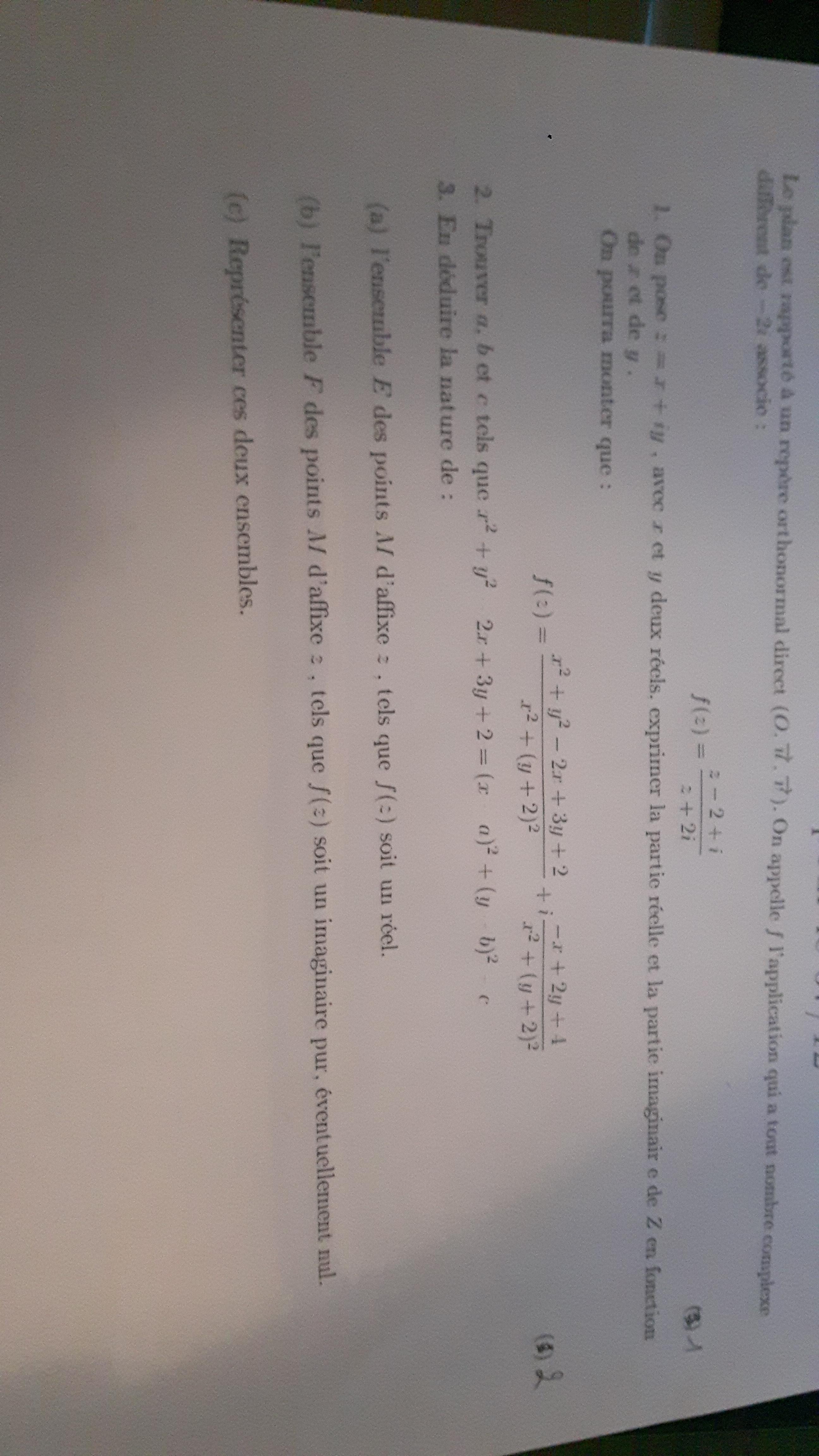 chacha778 Posté(e) le 6 décembre 2017 Signaler Posté(e) le 6 décembre 2017 Bonsoir à tous, j'ai un dm à faire mais je bloque un petit peu. J'ai compris mon chapitre mais j'ai du mal pour l'application sur certains exercices, notamment celui-ci. +Le plan est rapporté à un repère orthonormal direct (O, u, v) On appelle f l'application qui a tout nombre complexe différent de -2i associe: f(z)= z-2+i / (z +2i) 1. On pose z= x + iy avec x et y deux réels, exprimer la partie réelle et la partie imaginaire e de Z en fonction de x et de y. On pourra montrer que: f(z)= (x2+y2+-2x+3y+2)/(x2+(y+2)2 +i(-x+2y+4)/(x2+(y+2)2 2. Trouver a b et c tels que x2+y2-2x+3y+2=(x-a)2+(y-b)2-c 3. En déduire la nature de: a. l'ensemble E des points M d'affixe z, tels que f(z) soit un réel b. l'ensemble F des points M d'affixe z, tels que f(z) soit un imaginaire pur, éventuellement nul c. Représenter ces deux ensembles Je pensais pour la question 1 du coup remplacé z par x+ iy mais ensuite je fais zbarre et je remplace z par x- iy ? Je ne suis pas bien sûr de moi, ce qui fait que je bloque dès le départ. Merci d'avance pour vos explications et votre aide, bonne soirée ! ( Je vais mettre les équations en photo ci dessous car j'ai beau eu essayé de mettre en fraction mais cela ne faisait pas mon résultat..)