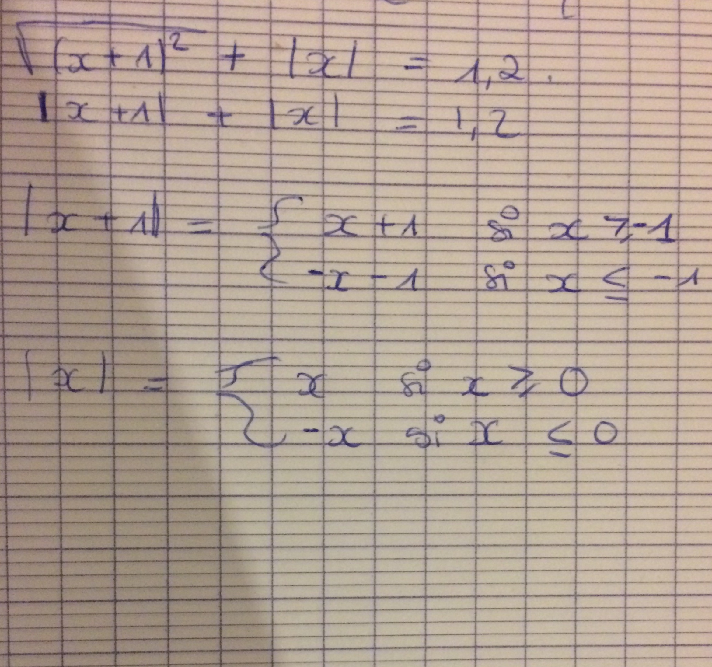 E-Bahut Barbidoux Posté(e) le 25 décembre 2017 E-Bahut Signaler Posté(e) le 25 décembre 2017 si x<-1 ==> |x+1|+|x|=-x-1-x=1.2 ==> x=-1.1 si -1≤x≤0 ==> |x+1|+|x|=x+1-x=1.2 ==>pas de solution si x>0 ==> |x+1|+|x|=x+1+x=1.2 ==> x=0.1