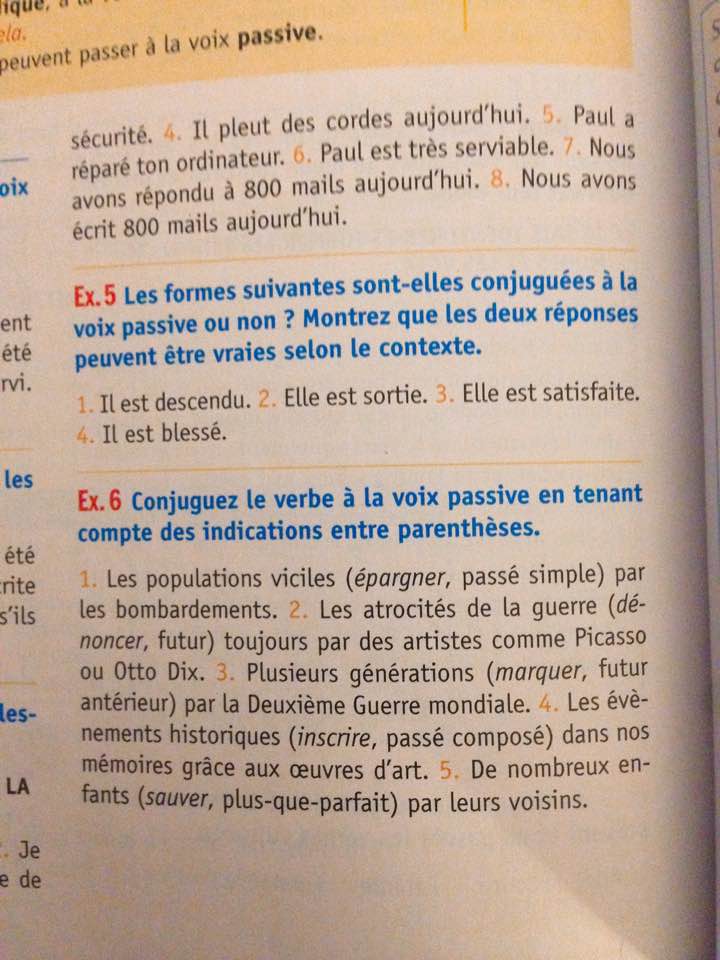 E-Bahut Mamy Posté(e) le 9 janvier 2018 E-Bahut Signaler Posté(e) le 9 janvier 2018 La voix passive est toujours conjuguée avec l’auxiliaire être. Certains verbes , intransitifs ( sans COD possible) se conjuguent uniquement avec l’auxiliaire être. Bailler: intransitif se conjugue avec "avoir" devenir: uniquement avec l’auxiliaire être , mais pas forcément voix passive Exemple : Tomber: Il est tombé sur la route (intransitif) .ce n'est pas la voix passive Il a tombé la veste ( transitif) pour avoir la forme passive, il faut un complément d'agent , ( pas forcément indiqué) et le sujet subit l'action. Or, Il est descendu,le sujet ne subit pas l'action. Voix active: Il a applaudi les sportifs Voix passive Les sportifs ont été applaudis ( complément d'agent non exprimé) Exercice6 1 les populations civiles ( Lol!) furent épargnées par les bombardements épargner : https://leconjugueur.lefigaro.fr/conjugaison/verbe/epargner_voix-passive.html Passé simple accord du participe passé avec le sujet ( auxiliaire être) par les bombardements : complément d'agent