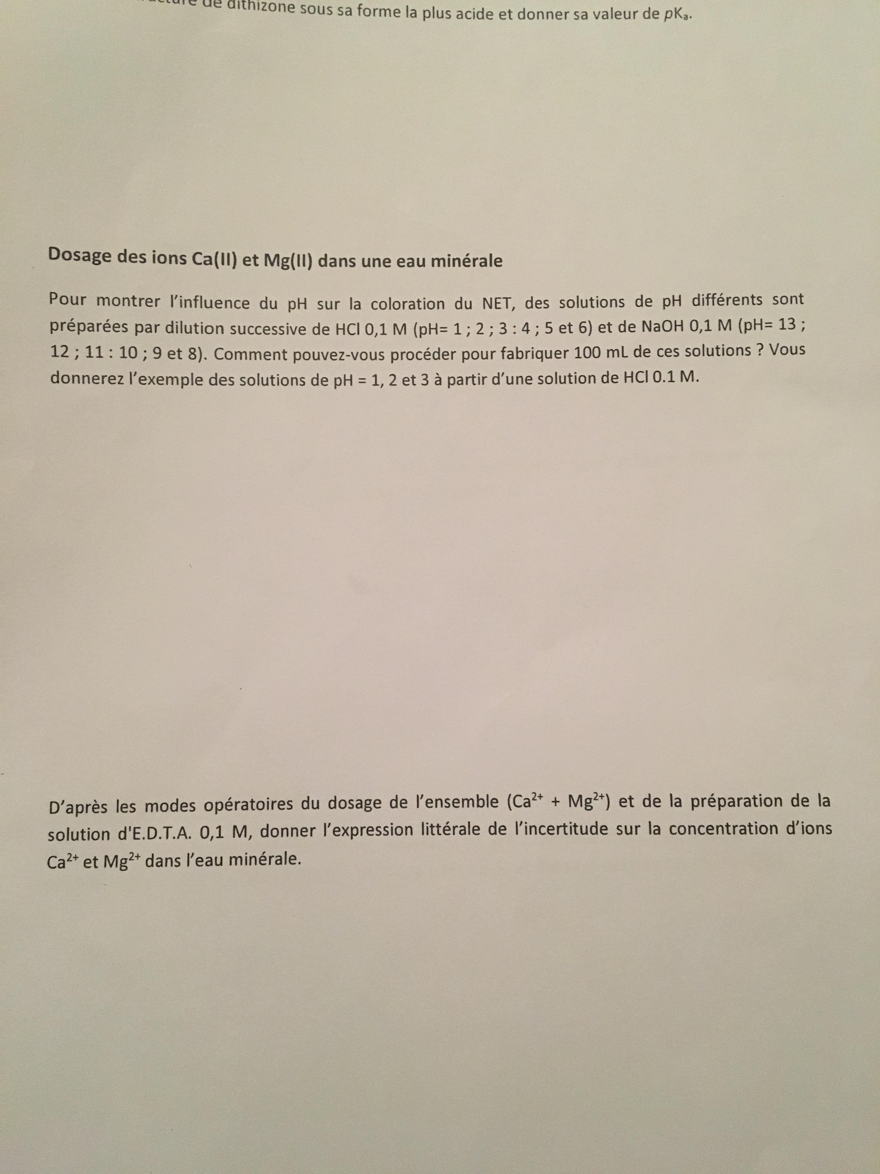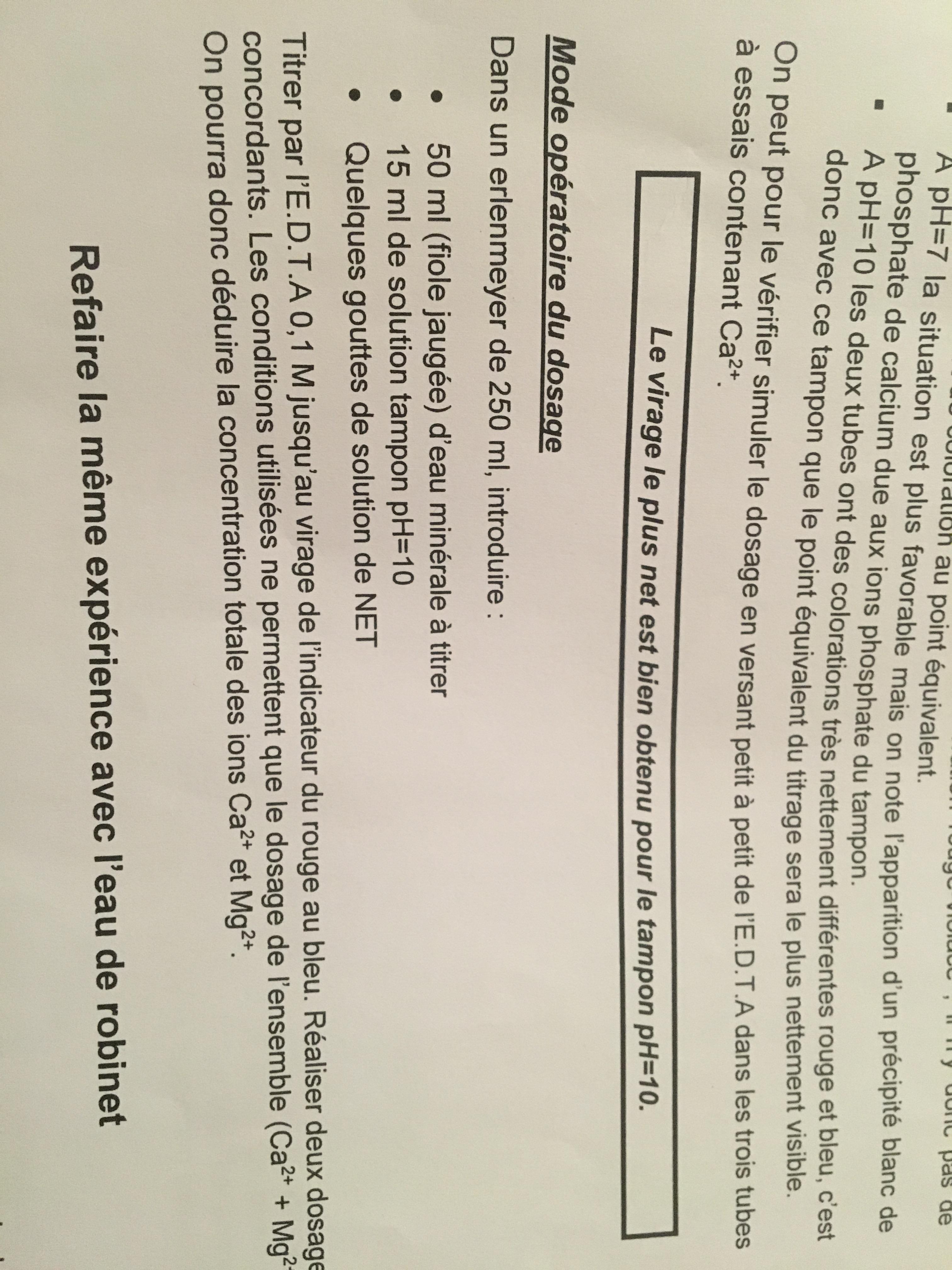 E-Bahut Barbidoux Posté(e) le 15 janvier 2018 E-Bahut Signaler Posté(e) le 15 janvier 2018 Solution mère HCl 0.1 mol/L sol pH=1 ==> solution HCl 0.1 mol/L sol pH=2 ==> solution HCl 0.1 mol/L diluée 10 fois (10 mL de solution mère dans une fiole jaugée de 100 mL, on complète au trait de jauge avec de l'eau déionisée. sol pH=3 ==> solution pH=2 diluée 10 fois (même technique de préparation) etc… ------------ Solution mère NaOH 0.1 mol/L sol pH=13 ==> solution NaOH 0.1 mol/L sol pH=12 ==> solution NaOH 0.1 mol/L diluée 10 fois (10 mL de solution mère dans une fiole jaugée de 100 mL, on complète au trait de jauge avec de l'eau déionisée. sol pH=11 ==> solution pH=12 diluée 10 fois (même technique de préparation) etc… ------------ Pour l'autre question aide impossibles sans le mode opératoire de la solution d'EDTA (pesée, dilution ?)