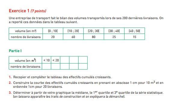 E-Bahut PAVE Posté(e) le 17 janvier 2018 E-Bahut Signaler Posté(e) le 17 janvier 2018 Il est 9 heures. Ton dernier message, si j'en crois ce qui s'affiche sur mon écran, a été posté il y a 7 heures soit à 2 heures du matin... à cette heure là, ne vaudrait-il pas mieux dormir ? Je vais essayer de t'aider mais cela va te demander un sérieux effort, continu et régulier si tu souhaites avancer un peu... ex 1 partie 1 question 1 Le tableau qui t'est donné te donne l'effectif de chaque classe : Il y a 20 livraisons (n1= 20) ayant un volume compris entre 0 m³ inclus et 10 m³ (non inclus) : 0 x1<10 Il y a 60 livraisons (n2= 60) ayant un volume compris entre 10 m³ inclus et 20 m³ (non inclus) : 10 x2<20 Peux tu en déduire combien de livraisons (cumul) ont un volume inférieur à 20 m³ donc un volume compris entre 0 et 20 (20 non compris) ? Si tu réponds correctement à cette question (on ne peut plus simple... c'est pas des "maths" !!), tu peux compléter le tableau de la partie 1. A toi. Je suis disponible ce matin donc réagis vite....