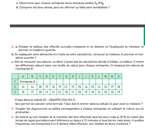 E-Bahut PAVE Posté(e) le 16 janvier 2018 E-Bahut Signaler Posté(e) le 16 janvier 2018 Bonjour, Quel est l'exercice qui te pose problème ? le 1 ou le 2 ? Plus précisément quelle question ? Les premières questions sont tellement faciles à faire (regrouper des valeurs) que je suppose que tu les as traitées. En utilisant ces tableaux de regroupement, les questions suivantes coulent de source. Dis nous ce que tu as trouvé, on vérifie et ensuite on pourra essayer les questions un peu plus délicates !!
