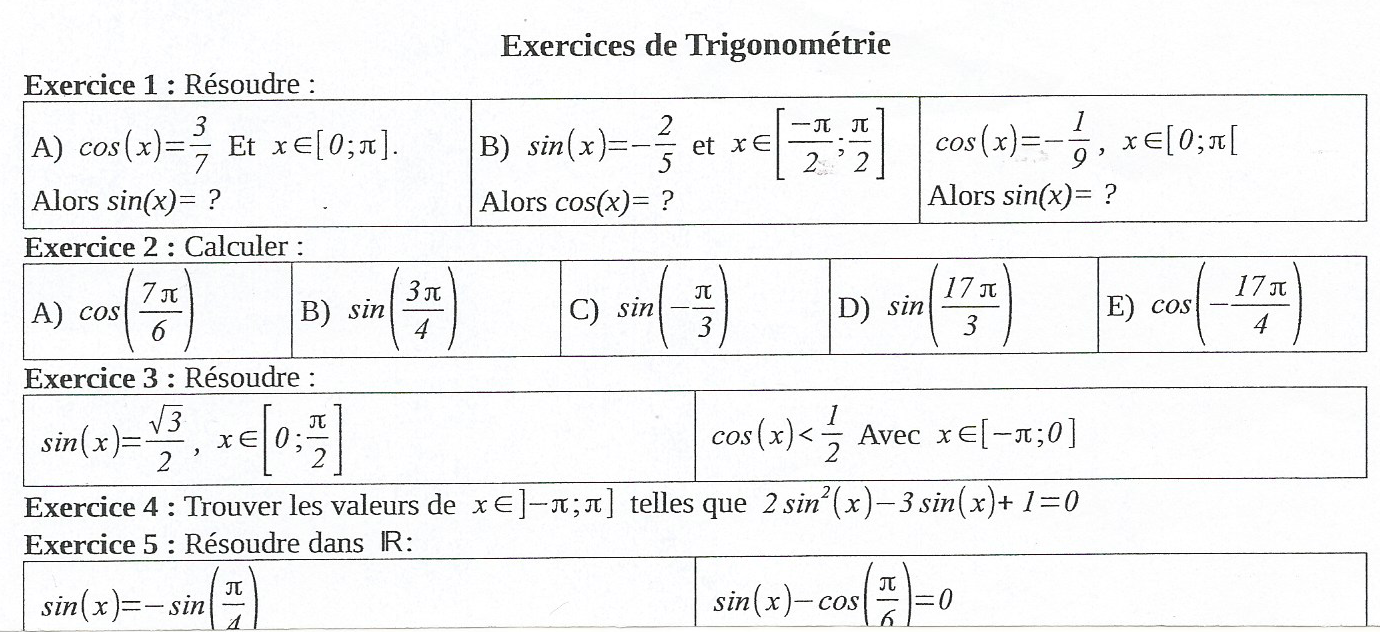 anylor Posté(e) le 17 janvier 2018 Signaler Posté(e) le 17 janvier 2018 Révélation AIDE pour l'exercice 4 ]-π ; π] 2sin²(x) -3sin(x) +1 = 0 Tu peux l'assimiler à une équation du second degré Si tu poses sin( x) = X Ce qui te donne 2X² -3X+1 = 0 Méthode du discriminant Pas de difficultés en terminale S puis Tu reviens à la valeur initiale c'est à dire que tu n'oublies pas que tu as posé sin(x) = X
