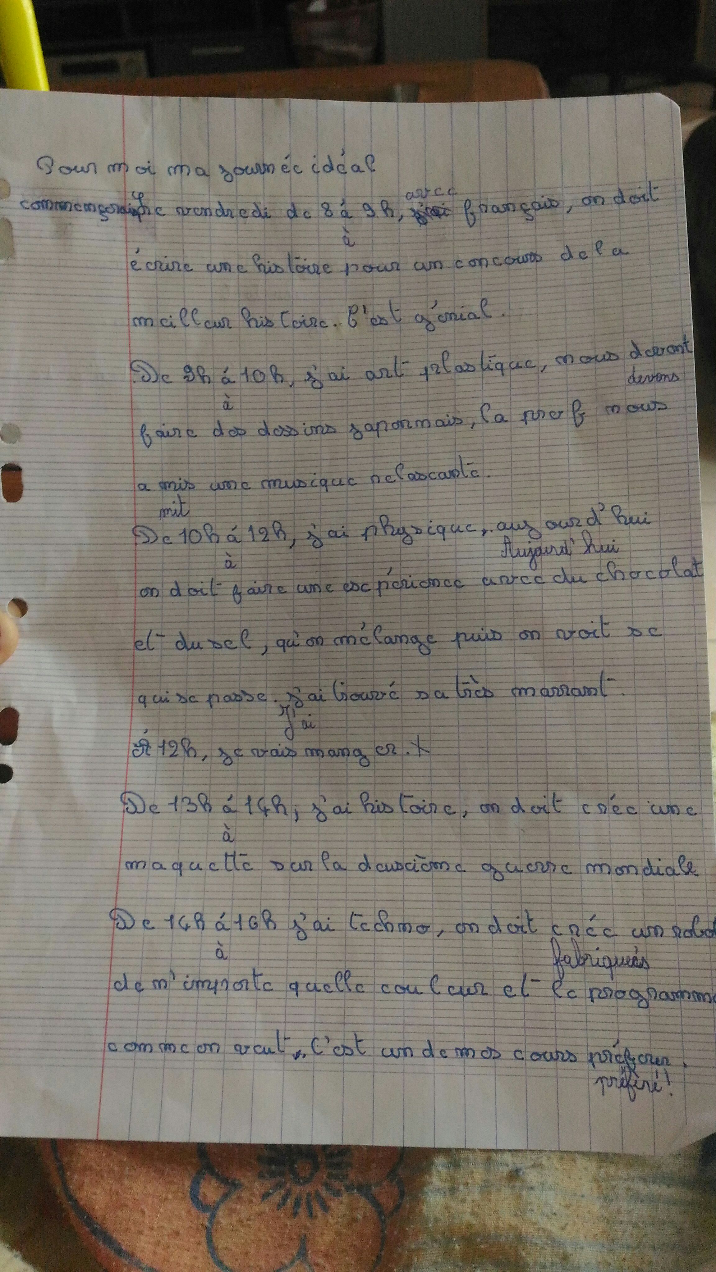 E-Bahut Jean B Posté(e) le 8 février 2018 E-Bahut Signaler Posté(e) le 8 février 2018 Pourquoi l'as-tu écrit en français alors qu'on t'a demandé de le faire en anglais ? Serais-tu animée d'un esprit de contradiction ? Je te donne le début : My ideal school day starts at 8 a.m. with a French lesson: we have to write for the best story competition, that's great! À toi la suite.