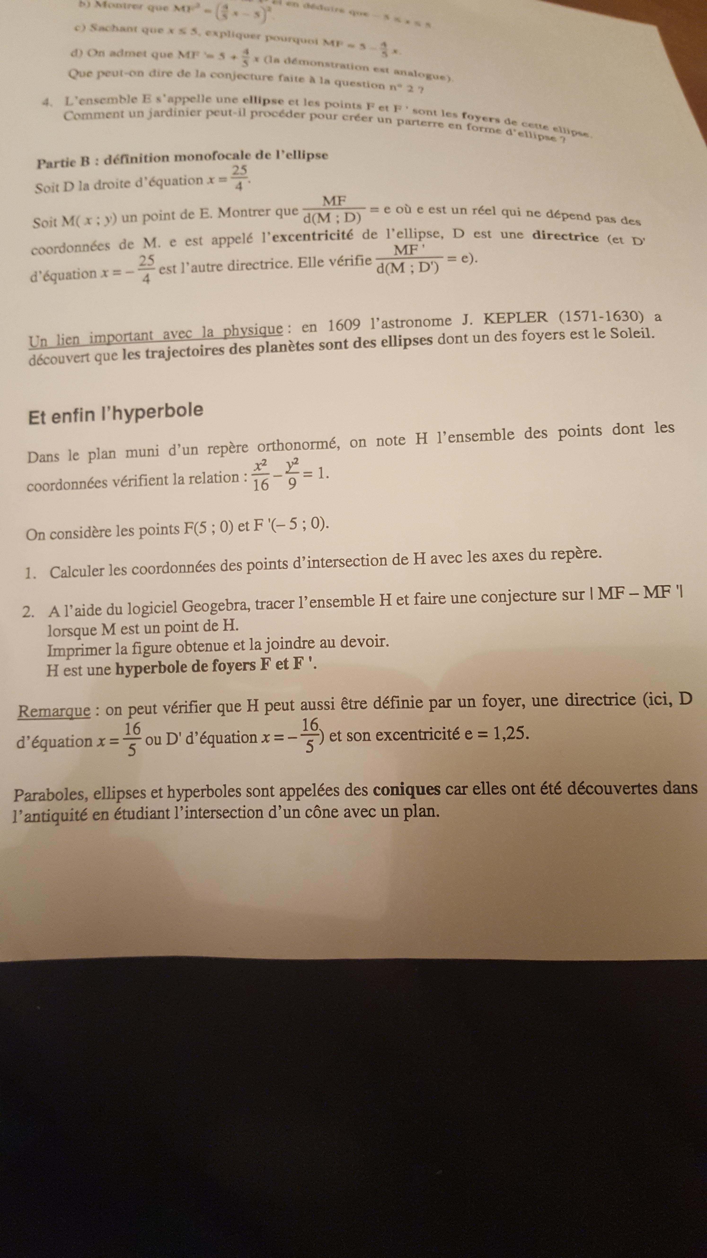 Cam0640 Posté(e) le 7 février 2018 Signaler Posté(e) le 7 février 2018 Bonjour ! J'aurais besoin de votre aide sur un exercice où je bloque complètement. Voici l'exercice sur l'hyperbole 1) coordonnés des points de H avec les axes du repère (4;0) (-4;0) (0;3) (0;-3) ? 2) ?