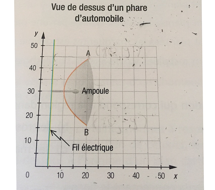 MrX Posté(e) le 17 février 2018 Signaler Posté(e) le 17 février 2018 Bonsoir, Alors pour le numéro 19) je rencontre des difficultés voici l’énoncé:Dans le plan cartésien ci-dessous, où les graduations sont en centimètres, on a représenté la vue de dessus d’un phare d’automobile parabolique. Le fil électrique qui sert à alimenter l’ampoule correspond à la directrice de la parabole associé à cette situation. Déterminer le diamètre de ce phare d’automobile, soit la diamètre de ce phare d’automibile, soit la distance qui sépare les points A et B. Ma démarche (y-k)^2=4c(x-h). S(10,30) c=5 (y-30)^2=4(5) (x-10) (y-30)^2=20(x-10) (y-30)^2=20(20-10) (y-30)^2=200 Rendu ici coincé . Merci de votre aide Ah finalement j’ai trouvé comment faire en la transformant en une équation de degré 2