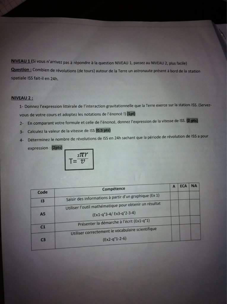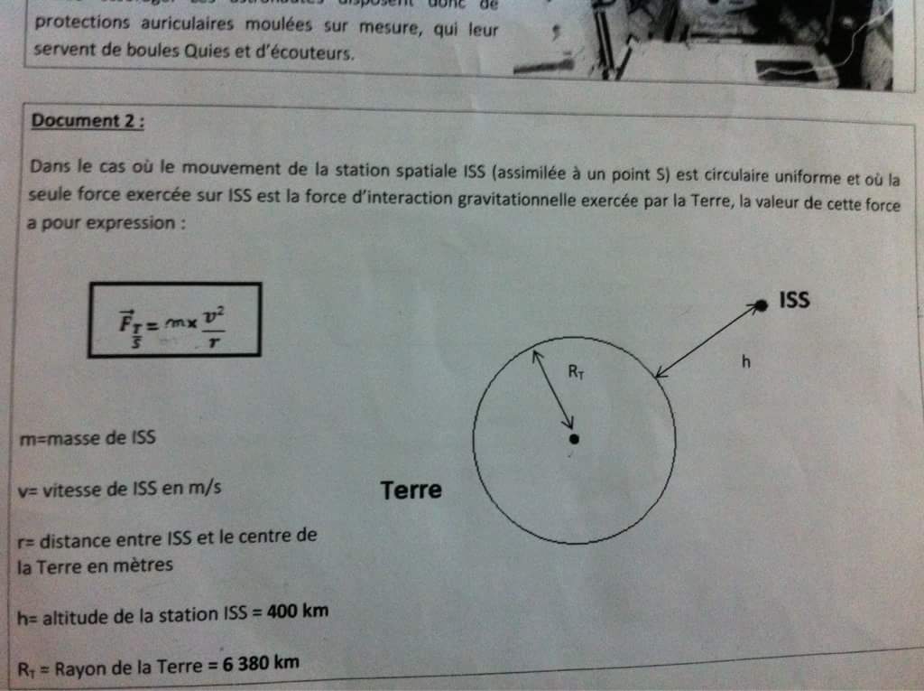 Milton54 Posté(e) le 27 février 2018 Signaler Posté(e) le 27 février 2018 Bonjour, je suis en 1S. J'ai donc ce devoir maison à faire et je bloque la seconde question. Je n'arrive pas à trouver l'expression de la vitesse de ISS en comparant la formule de la question une ( celle de l"interraction gravitationnelle) et celle encadré dans l'énoncé. Merci