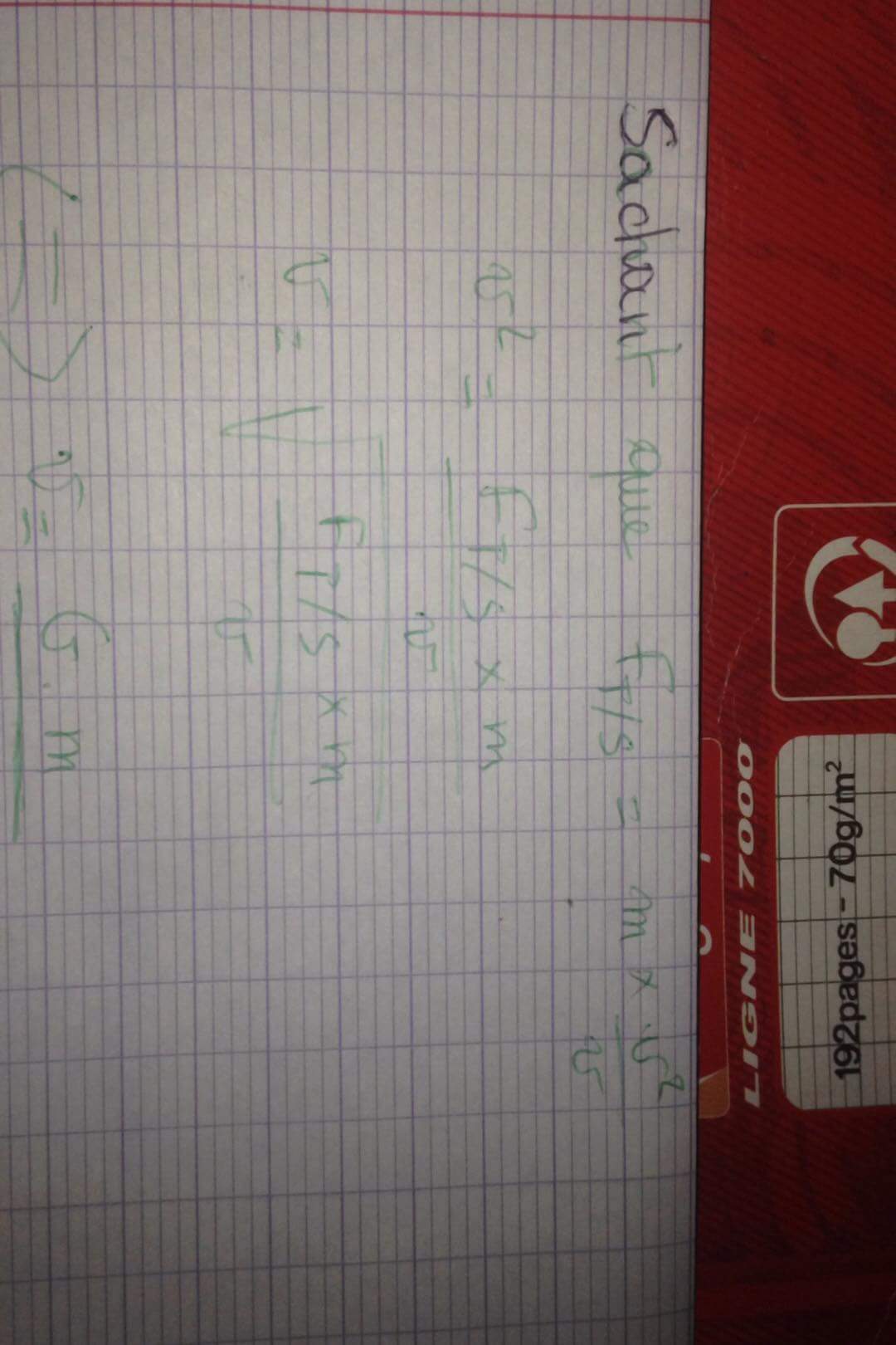E-Bahut julesx Posté(e) le 1 mars 2018 E-Bahut Signaler Posté(e) le 1 mars 2018 Je n'arrive pas à suivre les calculs sur tes feuilles manuscrites. Reprenons : 1) Dans le cours tu as interaction gravitationnelle G*mA*mB/d² Avec les notations de l'énoncé mA=M (masse de la terre) mB=m (masse de la station) d=RT+h (rayon de la terre+altitude de la station) 2) L'égalité des deux donne G*M*m/(RT+h)²=m*v²/r Sachant que RT+h=r (les deux désignent la même distance), il vient après simplification par m, v²=G*M/(RT+h) soit, comme tu l'as écrit à la fin (sauf que c'est la masse de la terre qui intervient) v=√[G*M/(RT+h)] Il ne te reste plus qu'à trouver la masse de la terre et à faire l'application numérique, en faisant attention aux unités.