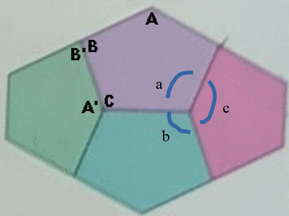 E-Bahut julesx Posté(e) le 1 mars 2018 E-Bahut Signaler Posté(e) le 1 mars 2018 Je suppose que tu n'as pas de problème pour construire le motif de base. Pour la faisabilité de l'assemblage, cf. ci-dessous, il faut vérifier * que les côtés s'ajustent, donc qu'il y a égalité des longueurs, exemple que BC=B'A' * que les angles s'emboitent, donc, par exemple, que a+b+c=360° (ou que a+b=c). Après, il n'y a plus qu'à... Si tu le maitrises, utilise ton logiciel de géométrie comme suggéré.