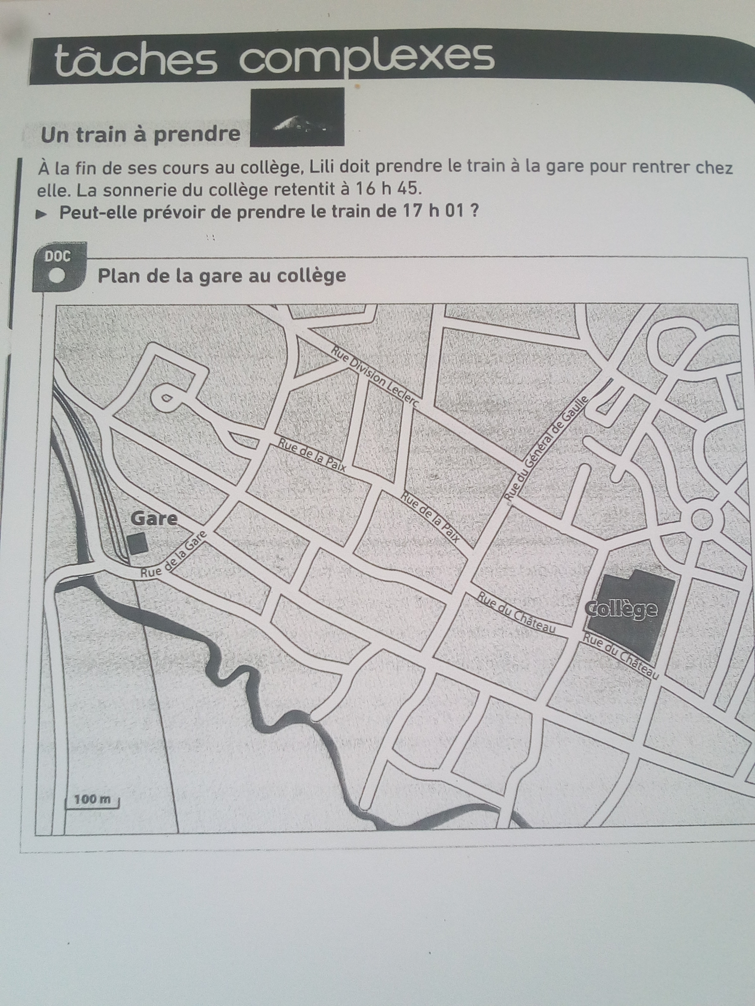 Clarisse deberdt Posté(e) le 31 mars 2018 Signaler Posté(e) le 31 mars 2018 Bonjour, j'ai besoin d'une grande aide pour un devoir maison en mathématiques. J'ai besoin d'aide le plus vite possible s'il vous plaît. Je dois le rendre mardi. Merci à vous. A la fin de ses cours au college, Lili doit prendre le train a la gare pour rentrer chez elle. La sonnerie du collège retentit à 16h45. Peut-elle prévoir de prendre le train de 17h01? sachant qu'un pieton marche a une vitesse de 5km/h.