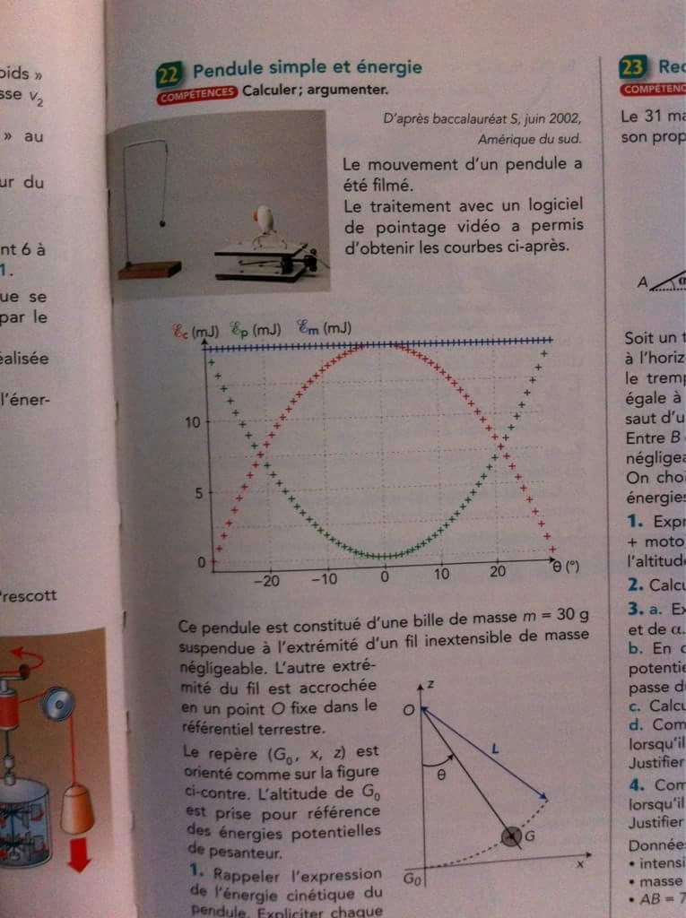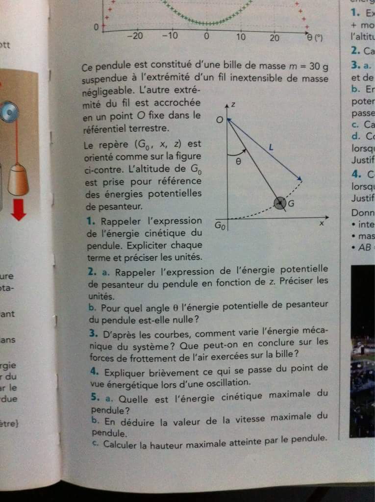 E-Bahut Barbidoux Posté(e) le 11 avril 2018 E-Bahut Signaler Posté(e) le 11 avril 2018 3------------ Energie mécanique constante : système conservait. Pas de force de frottement de la bille sur l'air ou forces de frottement négligeables 4------------ Transformation réciproque énergie potentielle <---> énergie cinétique de la bille lors de l'oscillation du pendule 5------------ Energie cinétique maximale de la biome en G0, égale à l'énergie mécanique soit 12 mJ vitesse maximale de la bille m*Vmax^2/2=Em ==> Vmax=√(2*Em/m)=√(2*12.*10^(-3)/0.03)=0.894 m/s Hauteur maximale atteinte par le pendule lorsque Ep=Em ==> m*g*h=Ep ==> h=Ep/(m*g)=12*10^(-3)/(9.81*0.03)=0.04 m =4 cm