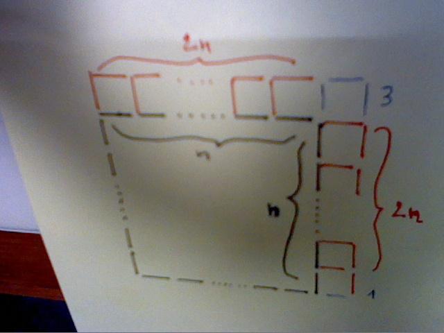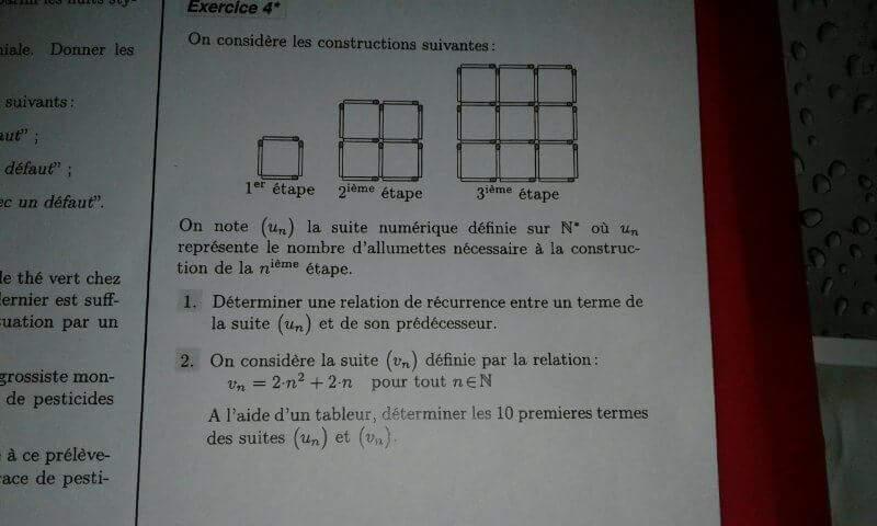 E-Bahut julesx Posté(e) le 26 mai 2018 E-Bahut Signaler Posté(e) le 26 mai 2018 Pour passer de un à un+1... Cf. image jointe, désolé pour la qualité ! * on part du carré un ayant n allumettes de chaque côté (en noir) * on rajoute sur chacune des n allumettes 2 allumettes (en rouge), soit au total, 2*2n allumettes * on complète l'angle supérieurs de 3 allumettes (en bleu) * on complète le carré dans l'angle inférieur par 1 allumette (en bleu). Au total, on a donc rajouté 2*2n+3+1=4n+4=4(n+1) allumettes, d'où la relation de récurrence un+1=un+4(n+1) Pour calculer les un tu utilises la relation de récurrence u1=4 u2=u1+4(1+1)=4+8=12 u3=u2+4(2+1)=12+12=24 etc...