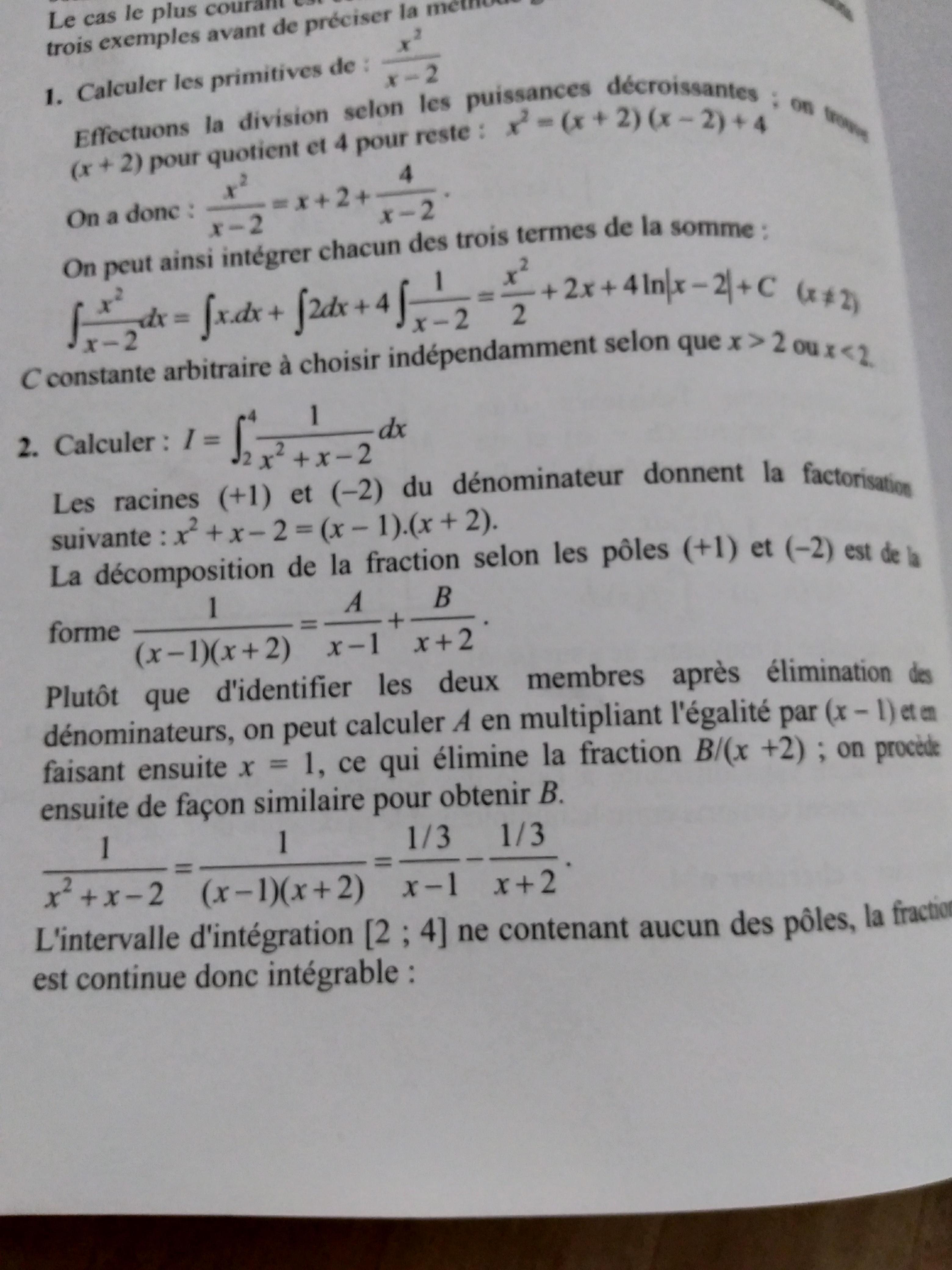 C8H10N4O2 Posté(e) le 26 juillet 2018 Signaler Posté(e) le 26 juillet 2018 Bonjour à toutes et tous ! J'étudie une méthode pour décomposer 1/[(x-1)(x+2)] en une expression de la forme : A/(x-1) + B/(x+2) (voir photo) Elle consiste à multiplier l'égalité entre ces deux expressions par (x-1), ce qui donne : 1/(x+2) = A + B(x-1)/(x+2) Puis (et c'est là où ça coince) il est dit de poser x=1 pour éliminer le terme en B. Si quelqu'un pouvait m'expliquer ce point ce serait très gentil, parce que je ne suis pas familier de cette façon de donner à x une valeur arbitraire "qui nous arrange" . Merci d'avance