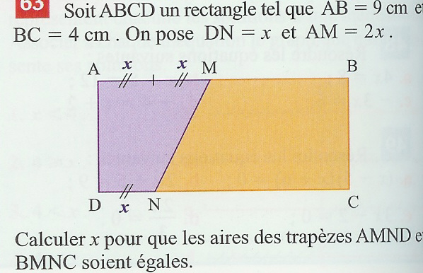 E-Bahut Lily la sale gosse Posté(e) le 29 février 2004 E-Bahut Signaler Posté(e) le 29 février 2004 aire d'un trapèze: ((b+B)*h)/2 ((AM+DN)*AD)/2 = ((MB+NC)*BC)/2 tu remplaces, tu dois trouver x=3 bonne chance bisous :P