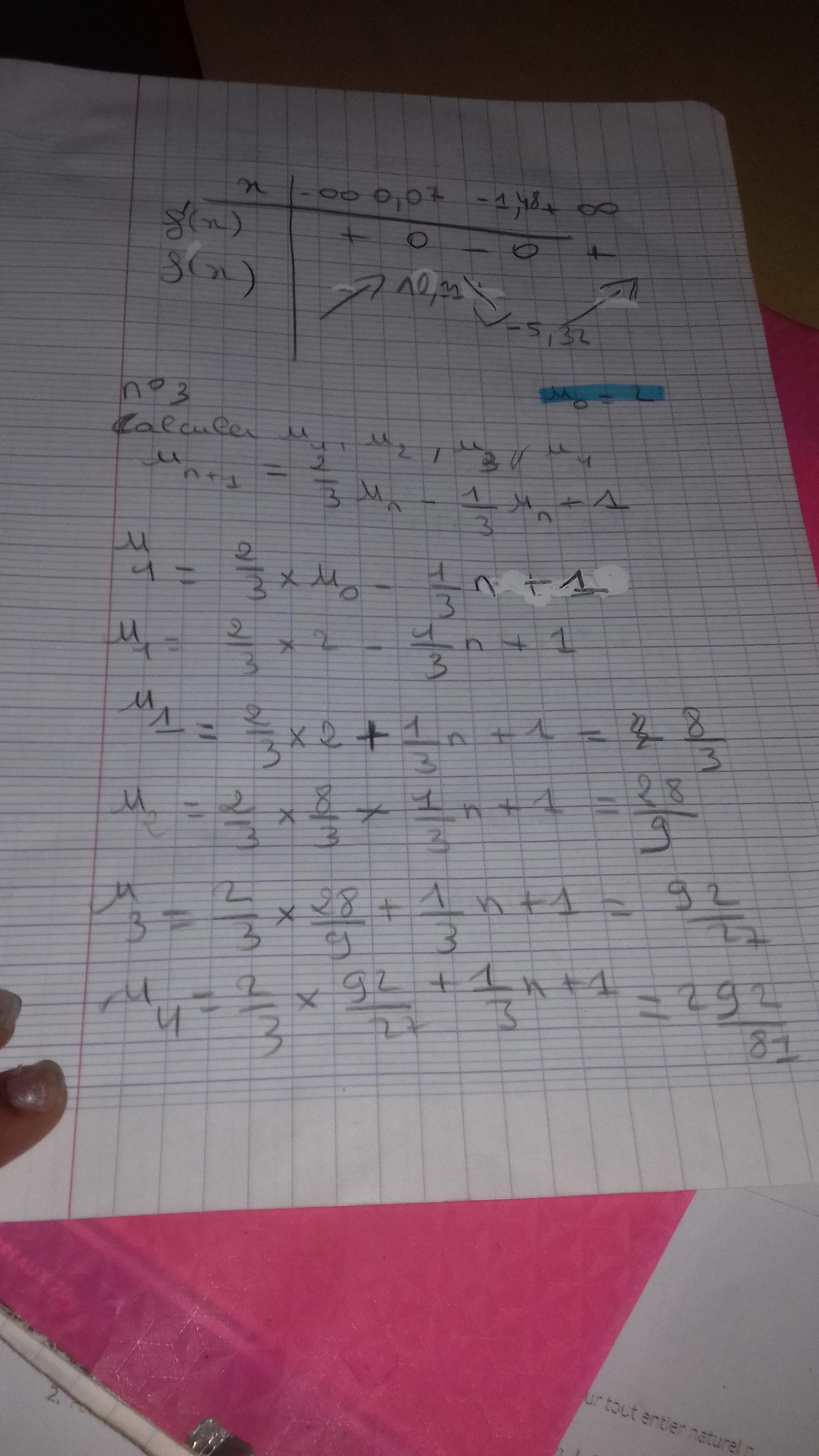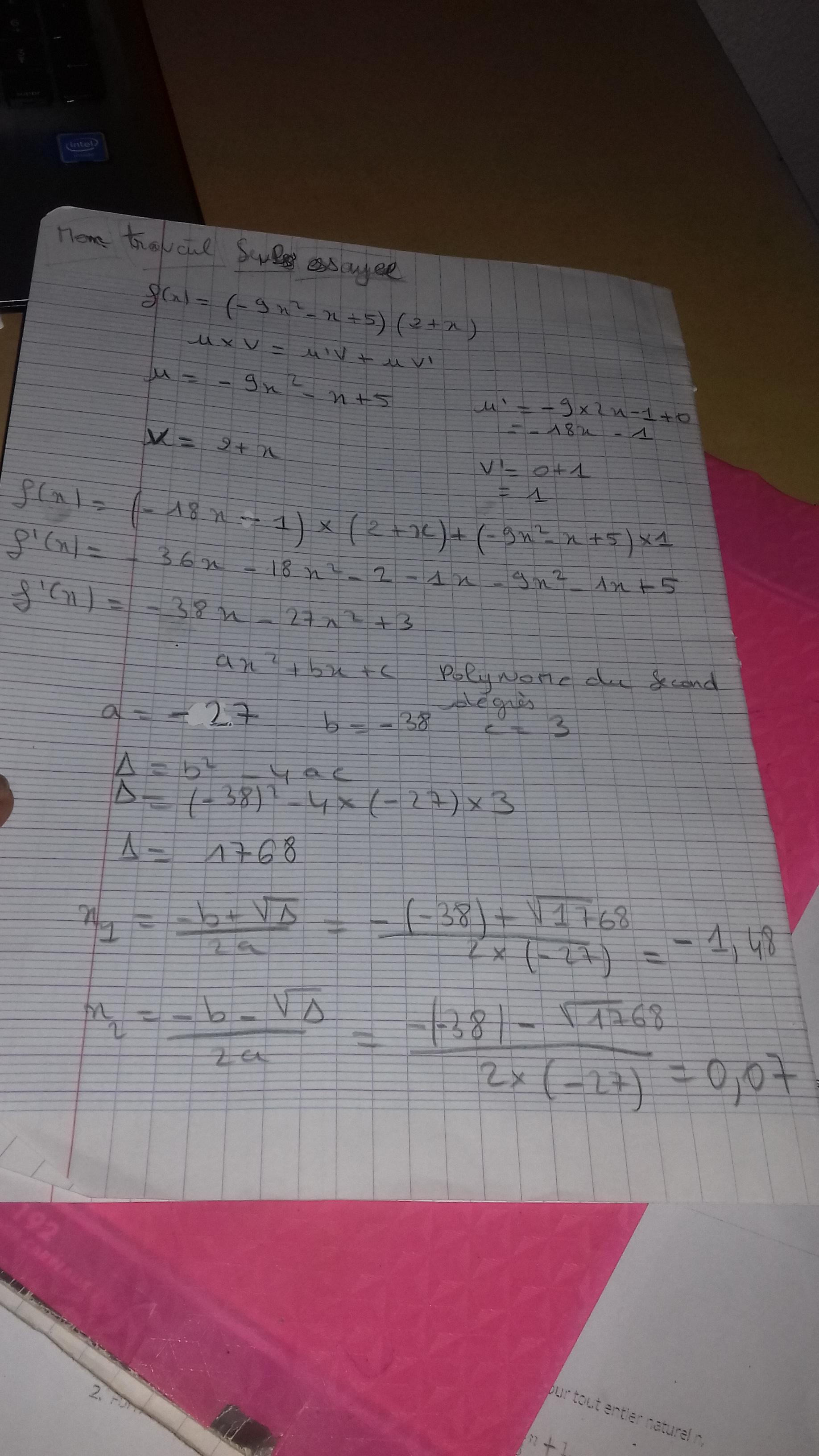 E-Bahut Barbidoux Posté(e) le 5 septembre 2018 E-Bahut Signaler Posté(e) le 5 septembre 2018 ——————————— exo 1 ——————————— f(1)=1 f’(0)=0 tangente // ) l’axe des x f’(1)=2/1=2 équation de la tangente (ordonnée à l’origine -1 y=2*x-1 ——————————— exo 2 ——————————— f(x)=(-9*x^2 - x + 5)*(2 + x)=-9 x^3 - 19 x^2 + 3 x + 10 Un polynôme est plus facile à dériver qu’un produit de deux polynômes f’(x)=-27*x^2-38*x+3 racines x1=(-19-√442)/27≈-1.482 et x2=(-19+√442)/27≈0.0749 du signe du coefficient de x^2 à l’extérieur de ses racines Tableau de variation : x………………….......…..x1………………………......x2………………….. f’(x)……..(-)…………..(0)………….(+)……….....(0)……….(-)…………. f(x)……décrois…….Min……..crois………….Max…….decrois………. Graphe de f(x) ——————————— exo 3 ——————————— Signes des termes de l’expression de la suite illisibles