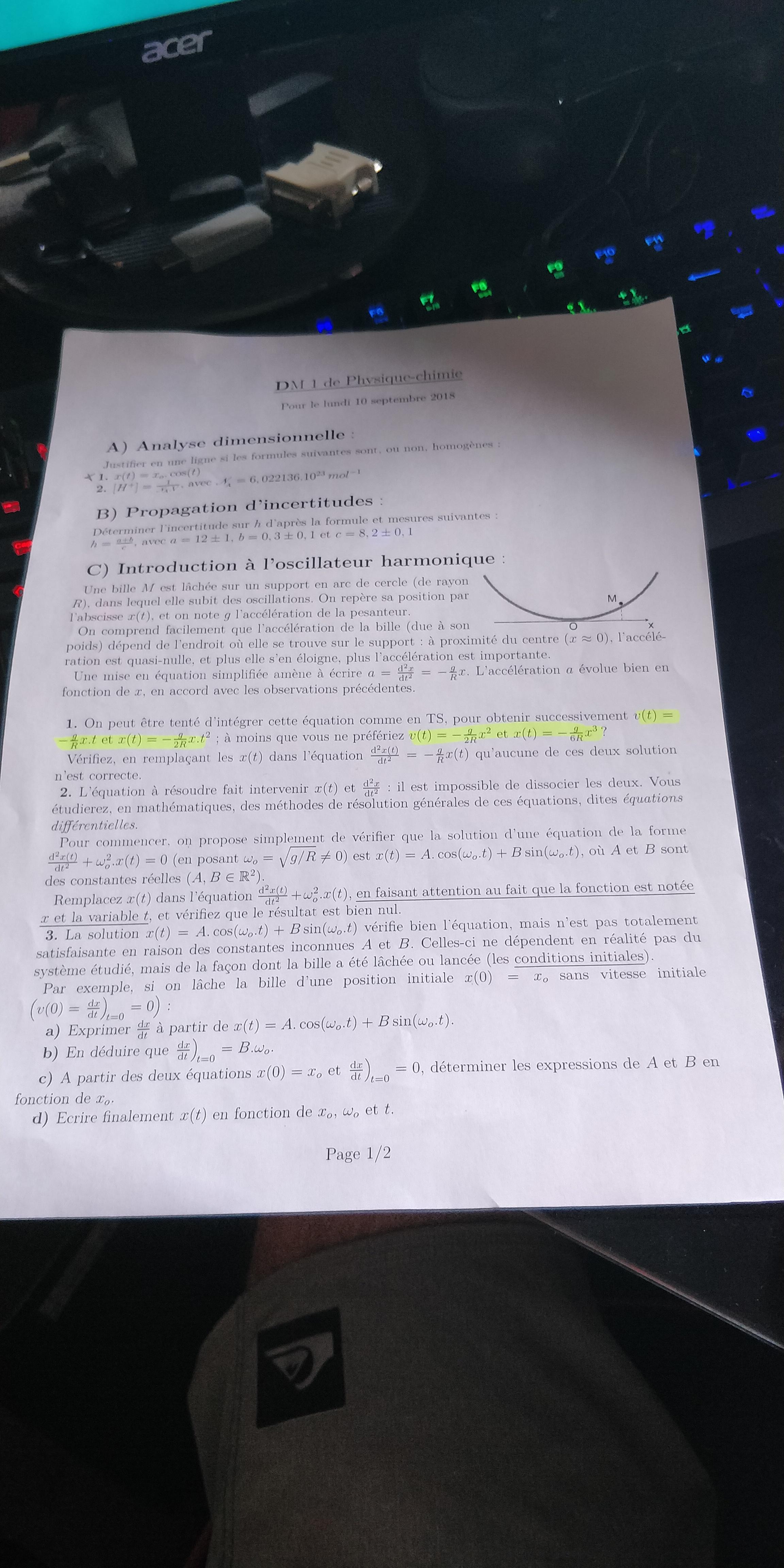 Chaka Posté(e) le 9 septembre 2018 Auteur Signaler Posté(e) le 9 septembre 2018 Re ! j'ai réussi la 1) et la 2) mais pour la 3) je trouve x0=x(0) = A et, du coup, dx/dt)t=0 soit v(0) = B.w0 donc cela veut dire que les expressions de A et B sont A=x(0) et B=v(0)/w0 ?? si oui, pour la d) ça me donne : x(t) = A*cos(w0*t)+Bsin(w0*t) = x0.cos(w0*t)+(dx/dt)t=0)/w0