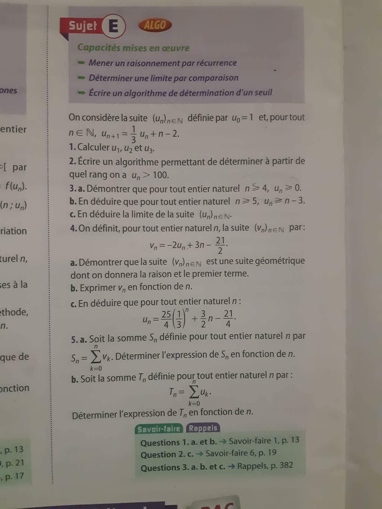E-Bahut Barbidoux Posté(e) le 9 septembre 2018 E-Bahut Signaler Posté(e) le 9 septembre 2018 3b———————— On démontre la proposition par récurrence vrai pour n=5 car un+1=un/3+n-2 ==> u5=u4/3+4-2=u4/3+2 > 5-2 On suppose que la proposition est vraie pour n. A l’ordre n+1 on a un+1=un/3+n-2 comme un≥n-3 alors un+1≥(n-3)/3+n-2=n/3+n+1-3≥n+1-3 La proposition étant vérifiée à l’ordre n+1 est héréditaire et valable quelque soit la valeur de n≥5