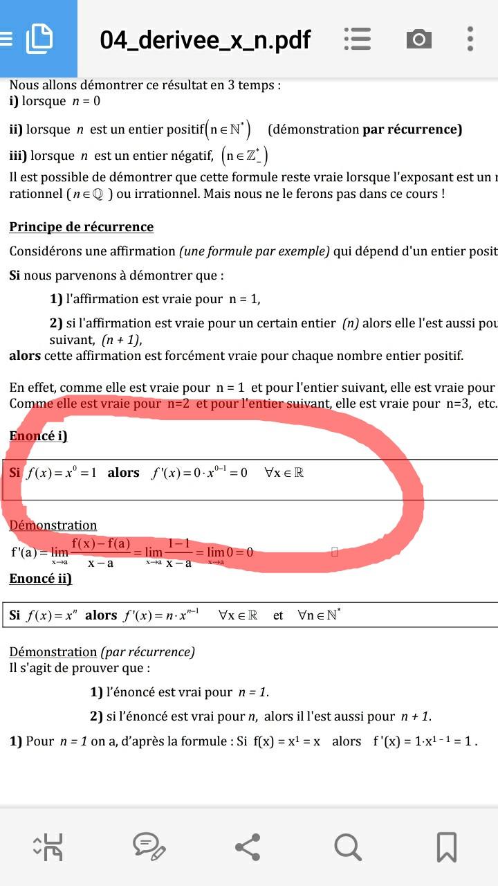C8H10N4O2 Posté(e) le 18 septembre 2018 Auteur Signaler Posté(e) le 18 septembre 2018 Oui effectivement c'est bien ce que j'avais en tête... Merci beaucoup pour ces explications. Une petite question subsidiaire qui ne vaut pas l'ouverture d'un sujet à part : je m'intéresse à la démonstration de la dérivée de x^n. J'ai trouvé une proposition où on commence par montrer que (x^n)' = n.x^(n-1) est vrai pour n égal à zéro et x un réel quelconque. Dans l'expression entourée de rouge en PJ, le x^(0-1) ne pose-t-il pas problème si x est nul ?
