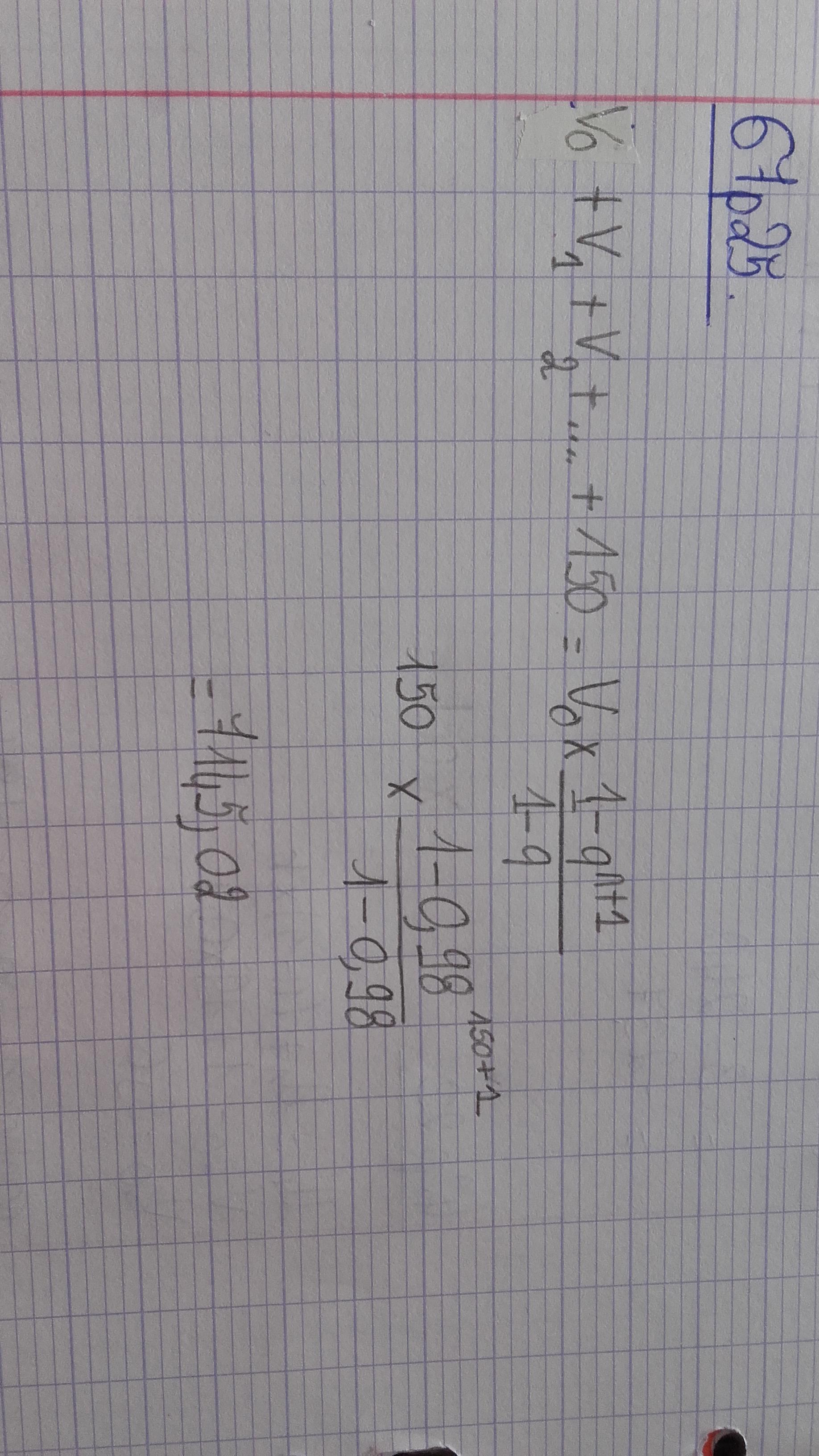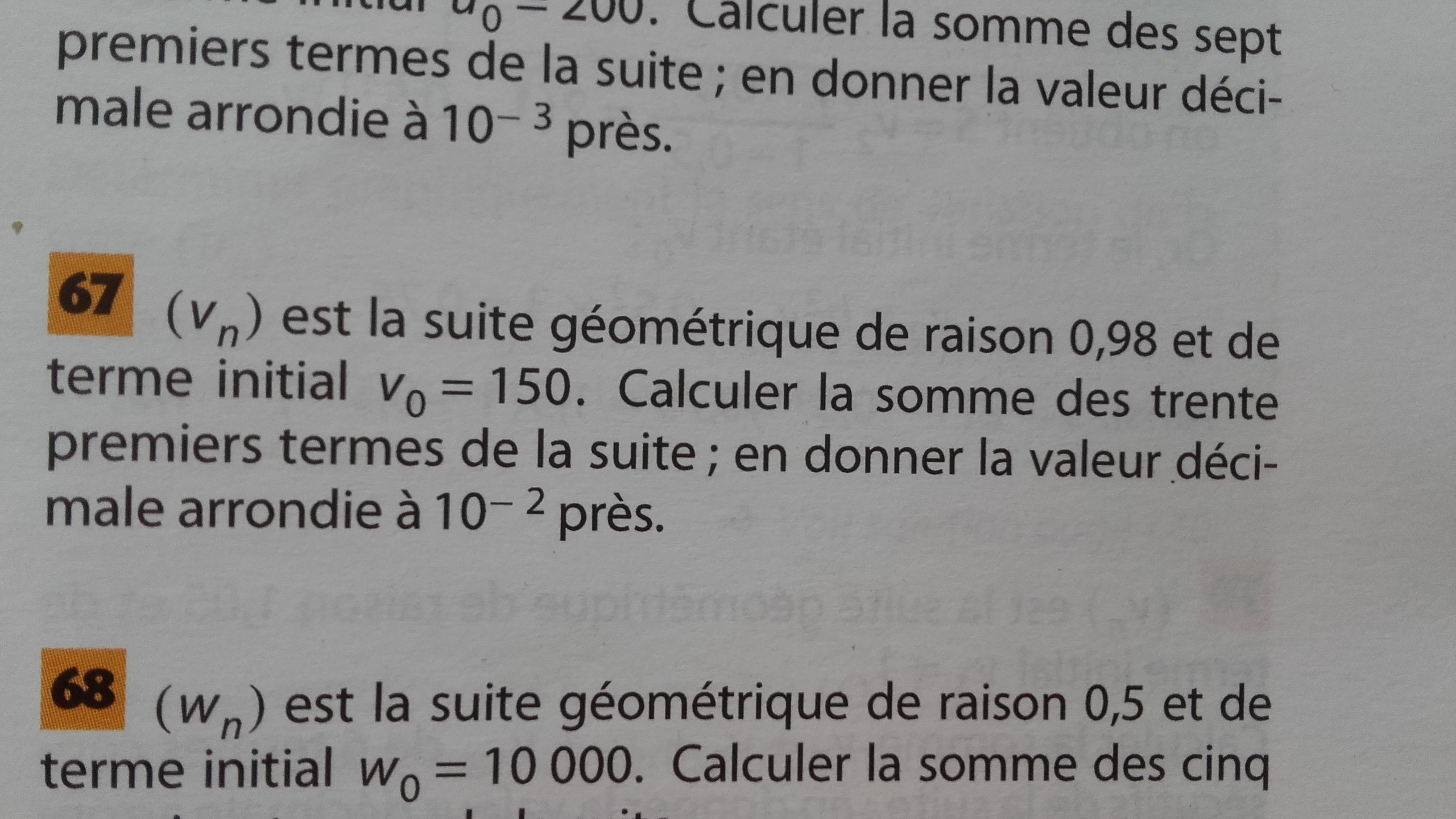 E-Bahut julesx Posté(e) le 29 septembre 2018 E-Bahut Signaler Posté(e) le 29 septembre 2018 Attention, ce devrait être ...+v150, pas ...+150, mais, de toute façon, ce n'est pas le bon indice final car tu confonds avec v0. Par ailleurs, il y a une autre erreur, l'indice final n'est égal au nombre de termes que si la suite commence à l'indice 1. Ici, comme elle commence à l'indice 0, l'indice final est égal au nombre de termes moins 1. En d'autres termes, n dans ton expression vaut 29 et l'expression de la somme est 150*(1-0,9829+1)/(1-0,98). Je te laisse faire le calcul est arrondir à deux chiffres après la virgule.