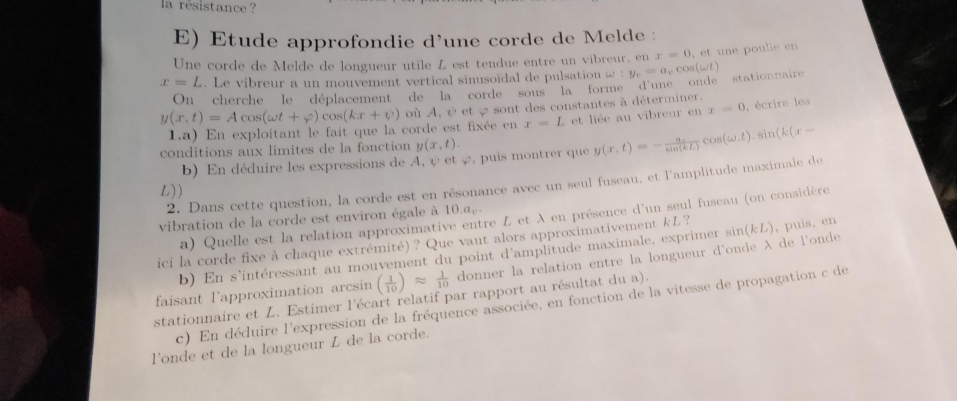 volcano47 Posté(e) le 1 octobre 2018 Signaler Posté(e) le 1 octobre 2018 ye= ae cos (wt +) cos(kx +) et y'(t) =0 pour t=0 (une condition nécessaire car on ne peut trouver 3 constantes avec seulement deux équations) y'(t) = -Awsin (wt+) cos(kx+) la vitesse est nulle pour t=0 au point de fixation donc sin =0 et =0 en x= 0, y =Acos wt cos en x =L , y =Acos wt cos (kL +) =0 pour tout t (corde fixée) ; ====> 0 =Acos wt cos (kL+) donc kL + =/2 et = /2 -kl on trouve cos (kx+ ) = - sin k(x-l) on trouve l' amplitude A par la condition ye =0 pout t=0 (et donc x=0 point de fixation) : ae =Acos cos= A cos qui nous donne A mais écrire sur ce site n'est pas commode , relie bien ce que j'ai écrit parce que je deviens chèvre ….