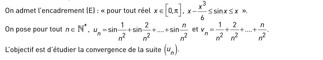 Ashe08 Posté(e) le 3 octobre 2018 Signaler Posté(e) le 3 octobre 2018 L'énoncé est dans l'image ! et voici les questions 1. Déduire de l'encadrement (E) que, pour tout n ∈ N(naturel), Un inférieur ou égale à Vn. Je l'ai fais mais j'en suis pas sur, voila ce que j'ai mis ; Selon l'encadrement (E), sin x inférieur ou égale à x. Nous savons que Un=sin n/n² et Vn= n/n². Nous pouvons alors en déduire que x= n/n²donc Un inférieur ou égale à Vn 2. a. Justifier que pour tout n ∈ N(naturel), 1^3 +2^3 +...+n^3 inférieur ou égale n^4. J'aimerais que l'on me réexplique la récurrence car je pense c'est qui faut faire ici b.En déduire, à l'aide de l'encadrement (E) que, n ∈ N(naturel), Vn-1/6n² inférieur ou égale Un. J'ai pas vraiment compris ce qu'il faut faire 3. Montrer que lim Vn = 1/2. En déduire que la suite (Un) est convergente vers un réel que l'on précisera. et ici je bloque Merci d'avance pour avoir voulu m'aider
