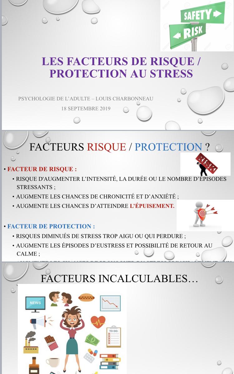 E-Bahut Mamy Posté(e) le 11 octobre 2018 E-Bahut Signaler Posté(e) le 11 octobre 2018 à l’instant, Itsme17 a dit : La Confiance en soi permet de moins stresser même s'il y a beaucoup de choses à apprendre. On se dit que l'on va quand même réussir. Pour la relation avec les enseignants, on peut dire que le faire d'avoir une bonne relation avec les profs permet de se dire que l'on a du support de l'aide et du soutien , même si la matière est difficile. Les facteurs de protection , sont l'inverse des facteurs de stress, ils te permettent de surmonter ton stress et d'être mieux, mais il faut apprendre à les utiliser.
