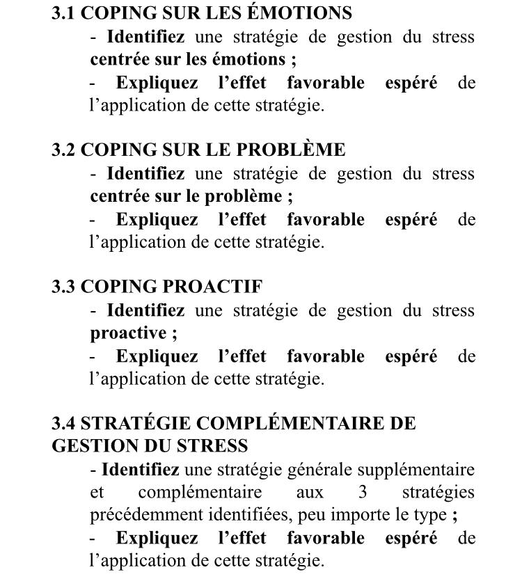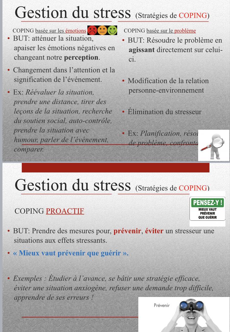 tulip12 Posté(e) le 12 octobre 2018 Auteur Signaler Posté(e) le 12 octobre 2018 il y a 4 minutes, Mamy a dit : Il semble que tu fasses ton travail à l'avance sans attendre le dernier moment, c'est une prévention . Tu demandes des explications sur ce que tu ne comprends pas, c'est une stratégie . Tu demandes de l'aide ( sur ce forum) ,tu élimines une partie du stress. Qu’est ce que l’image que je vous ai envoyer, il y a des stratégies la dans. Comme je ne comprends pas les 3 coping