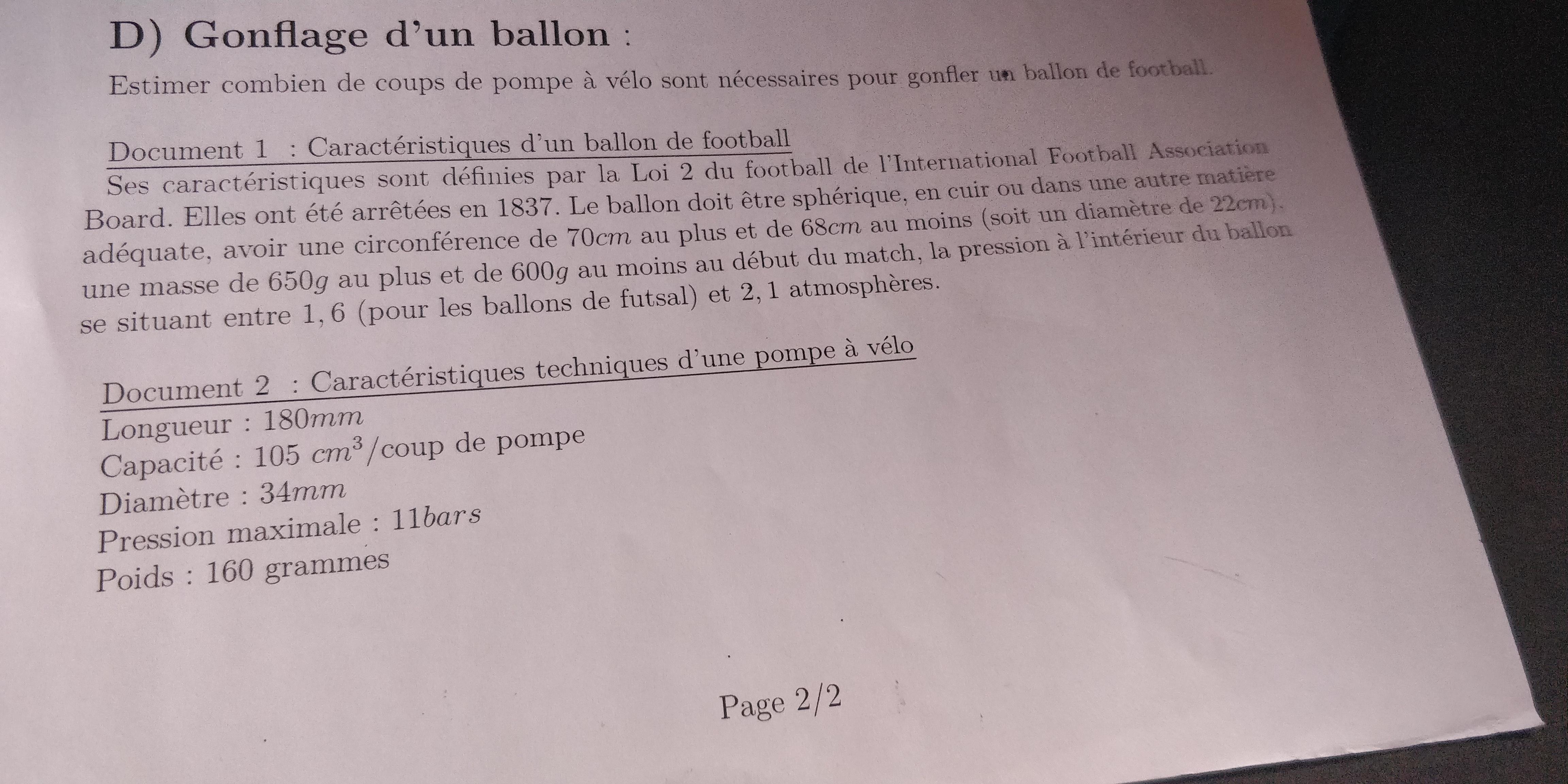 E-Bahut Barbidoux Posté(e) le 14 octobre 2018 E-Bahut Signaler Posté(e) le 14 octobre 2018 Application directe de la loi des gaz parfaits P*V=n*RT ==> Pballon*Vballon=k*Ppompe*Vpompe ==> k=Pballon*Vballon/(Ppompe*Vpompe)=(4/3)*π*r^3*Pballon/105. Pour 1.6 atm k=85 et 112 pour P=2.1 atm