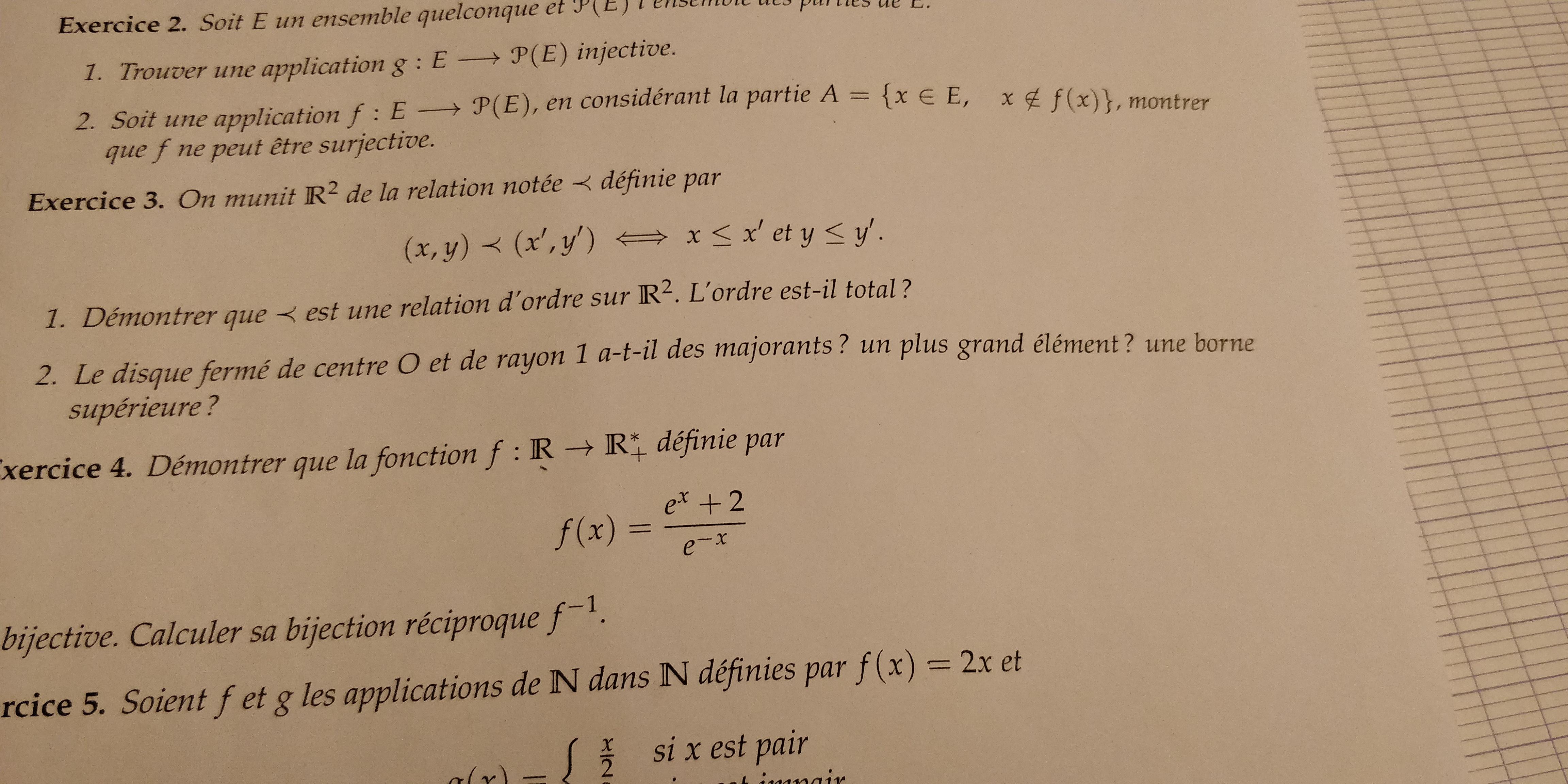 Chaka Posté(e) le 18 octobre 2018 Signaler Posté(e) le 18 octobre 2018 Bonsoir, pouvez vous m'aider pour l'exercice 3? Pour la question 1) je sais qu'il faut montrer que la relation d'ordre est réflexive transitive et antisymetrique cependant je ne sais pas comment le montrer Pour la 2) je pense utiliser l'équation de cercle mais je ne vois pas comment Merci d'avance