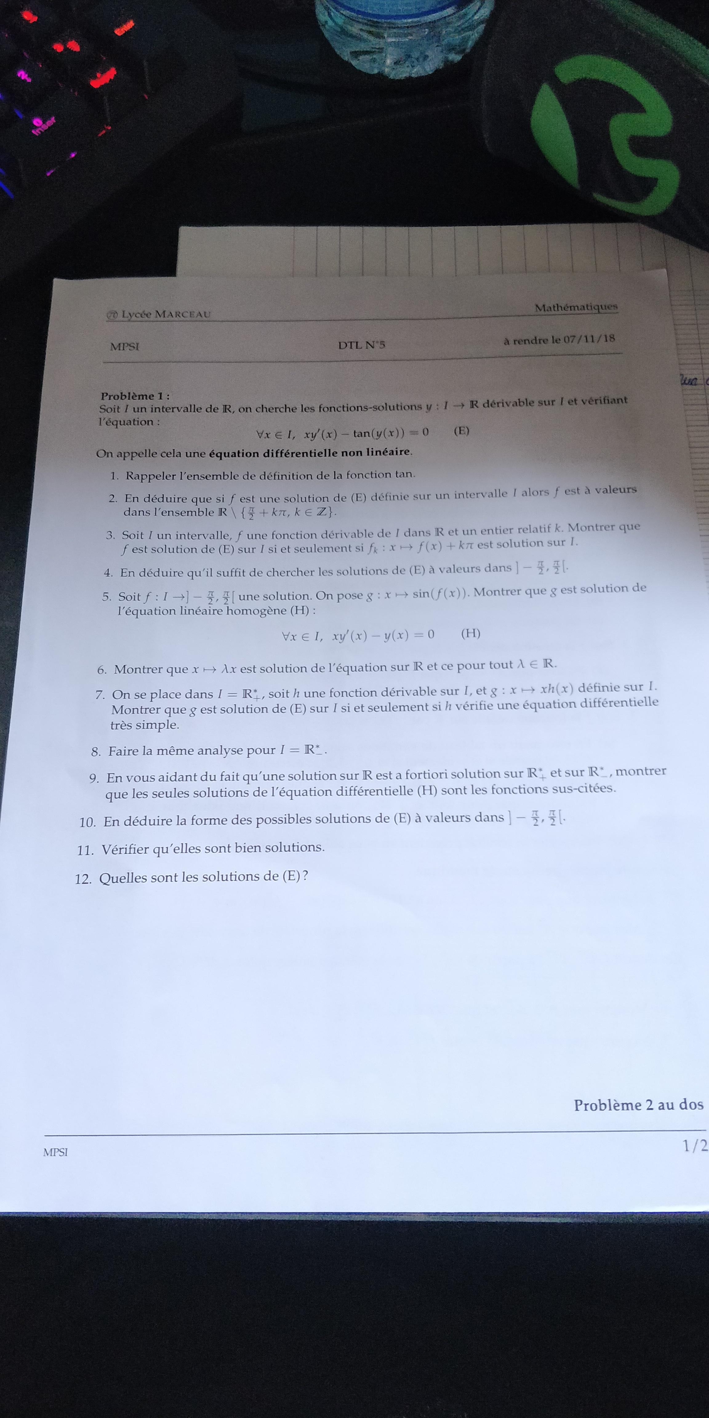 Chaka Posté(e) le 30 octobre 2018 Signaler Posté(e) le 30 octobre 2018 Bonjour, Ci-joint mon DTL/DM de découverte sur les équations différentielles. Je bloque à partir de la 2) (je ne vois pas ce qui est attendu et comment le montrer)... Pour la 1) j'ai : R\{-π/2 +2kπ ; π/2 + 2kπ} , k appartenant à Z Pouvez-vous me donner des pistes de réflexion pour les questions suivantes? Merci d'avance