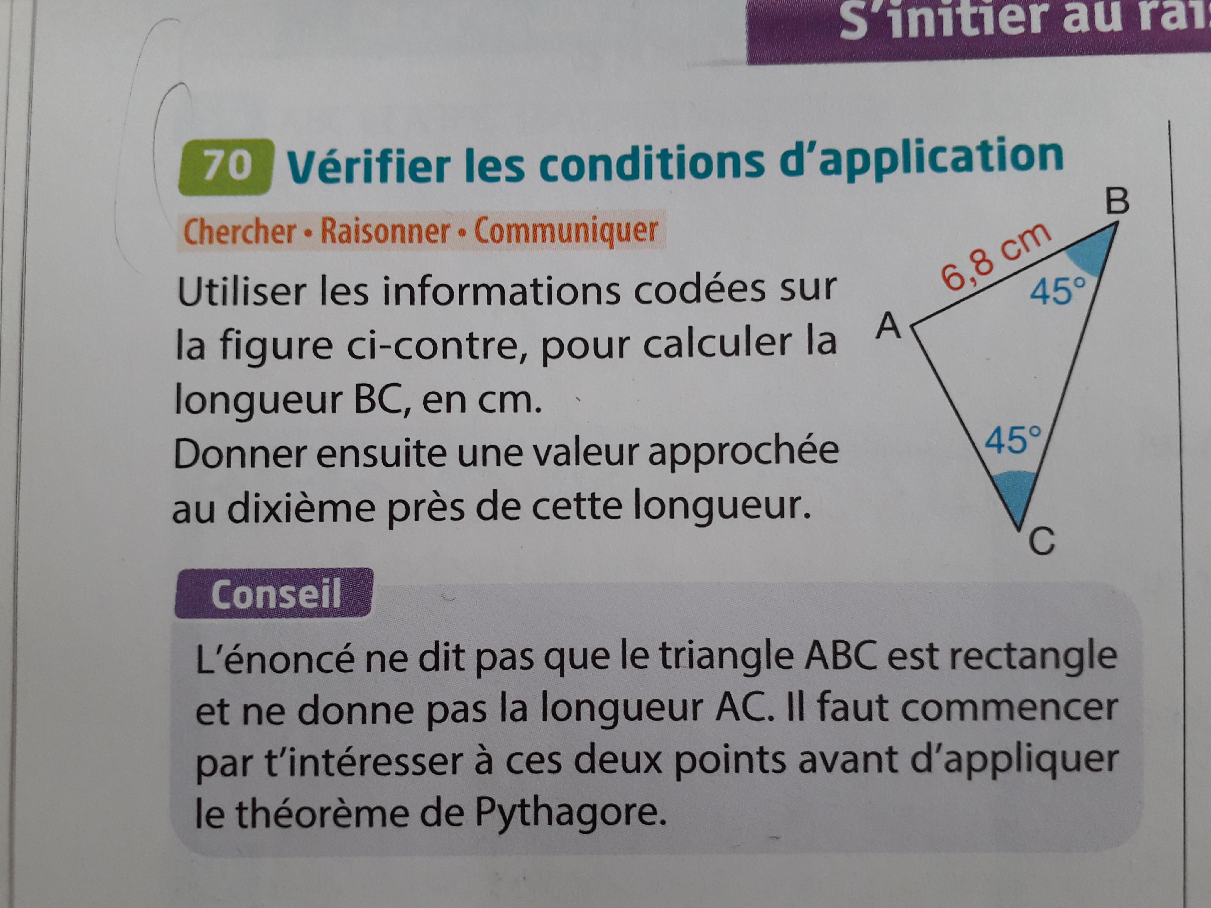 E-Bahut julesx Posté(e) le 31 octobre 2018 E-Bahut Signaler Posté(e) le 31 octobre 2018 Bonjour et bienvenue sur le site, Il faut effectivement commencer par calculer l'angle CAB. Que vaut la somme des angles dans un triangle ? Donc, comme les deux autres angles valent 45°... Sachant, en plus, que les angles BCA et CBA sont égaux, quelle est la nature exacte du triangle ABC ? Tu en déduis la longueur AC. Il ne reste plus qu'à faire appel à Pythagore pour obtenir la longueur de BC.