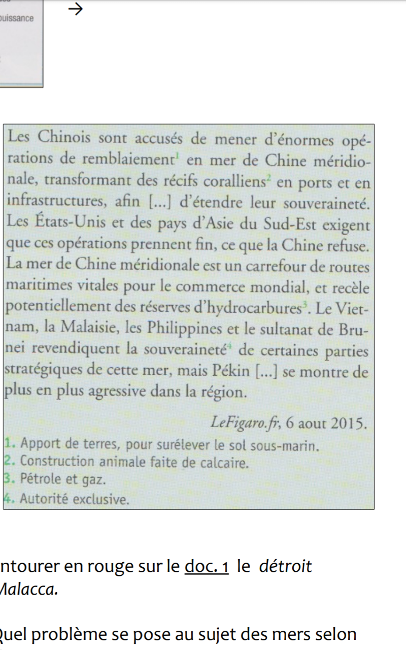 Invité Posté(e) le 5 novembre 2018 Signaler Posté(e) le 5 novembre 2018 Cc les amies aidez moi svp merci. Répondez a la question. 1.Quel problème se pose au sujet des mers selon ce document ? (Voir image). 2.relevez dans le document les différents pays en conflit dans la mer de Chine.