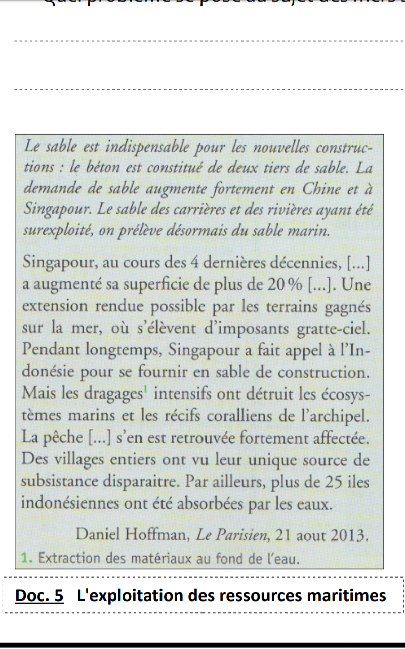 Invité Posté(e) le 5 novembre 2018 Signaler Posté(e) le 5 novembre 2018 Cc les amies aidez moi svp merci Fin de la répondre au questions: 1.Citez ans le texte les 2 activités mises en lien avec le prélèvement du sable. 2.Quel problème se pose au sujet des mers selon ce document ?