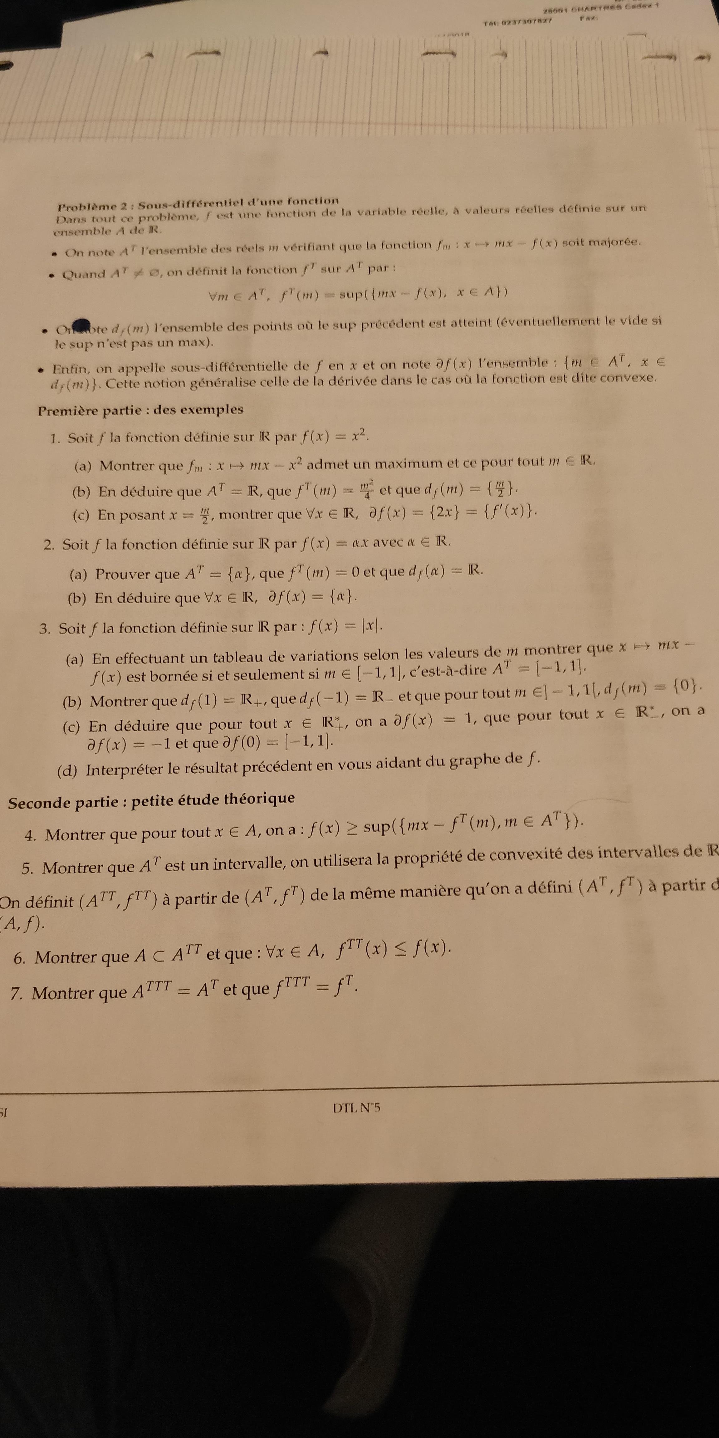 Chaka Posté(e) le 6 novembre 2018 Signaler Posté(e) le 6 novembre 2018 Bonsoir, ci-joint un exercice de DM sur lequel je travail. Je voudrais avoir une correction de mes réponses. Je modifierais ce message au fil de mon avancement sur l'exercice Merci d'avance Problème 2: Première partie: 1) a) f(x) =x^2 fm(x)= mx-x^2 définie sur R de la forme ax^2+bx+c avec a<0 donc fm admet bien un maximum b) on cherche z max tel que mx-f(x)=<z pour (m,x) € R2 (j'ai fais comme si je prenais la forme canonique et je calcul les coordonnées du sommet) forme cano : a(x-h)^2 +k h=-b/2a je trouve m/2 et k= 4ac-b^2=f(h)=m^2/4 c) on pose x=m/2 pour rappel f(x)=x^2 on a donc pour x=m/2: f(m/2) -> f'(m/2)=2m/2 = m on a donc bien ce que l'on cherche... 2) a)AT est l'ensemble des réels tel que f(x)=ax avec a € R mq f(x) = ax admet un maw uniquement pour AT = {a} or a € R donc {a} C R (inclus dans R) d'où f(x) = ax admet un max d'où AT = {a} mq ft (m)=0 or sup(mx)=ax donc mx-ax=0 d'où ft(m)=0 mq df(a)=R le sup étant 0 pour tout x € R on a bien un antécédent pour f(x) =ax = 0 tel que a=0 et a€R d'où df(a)=R