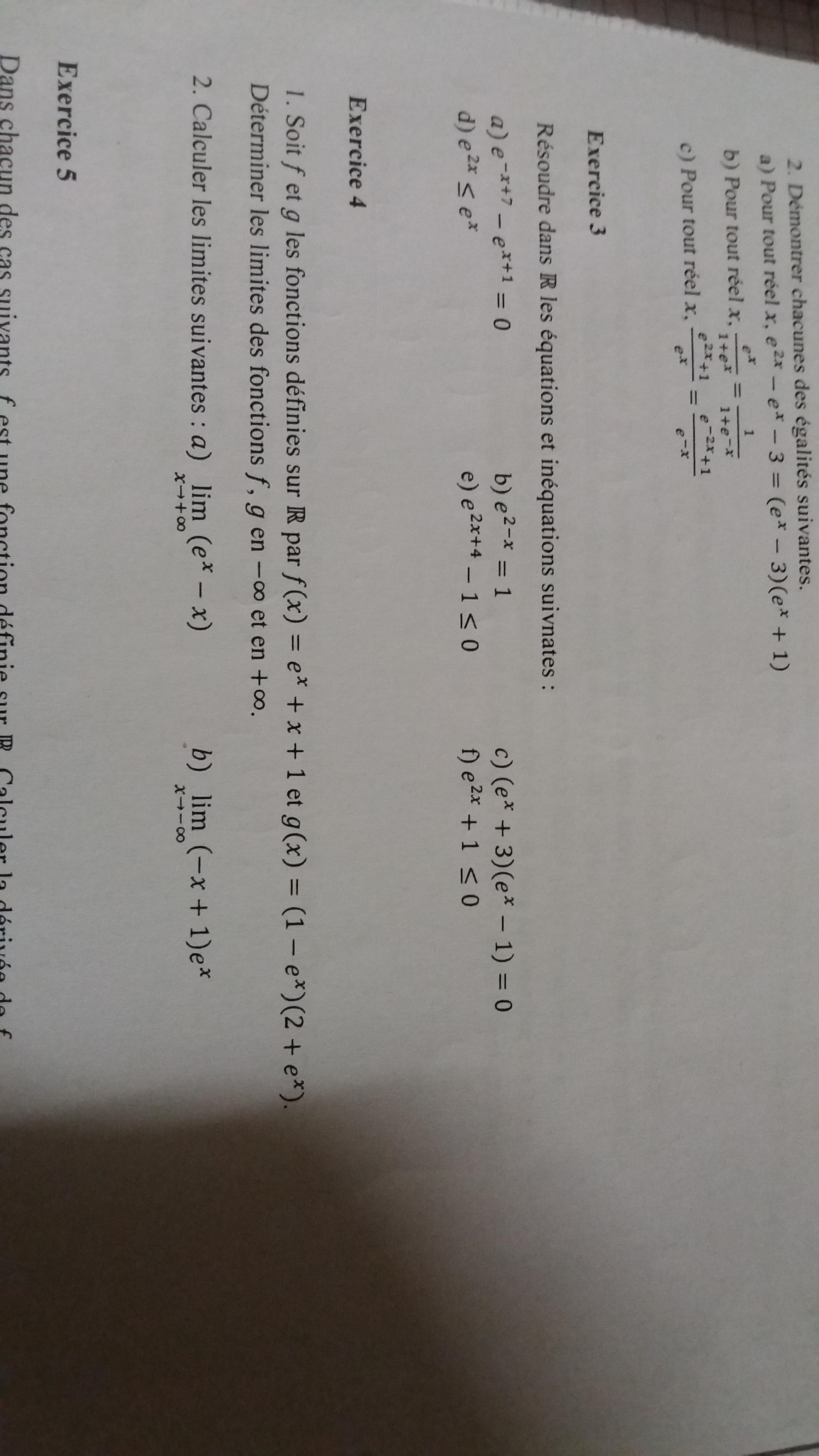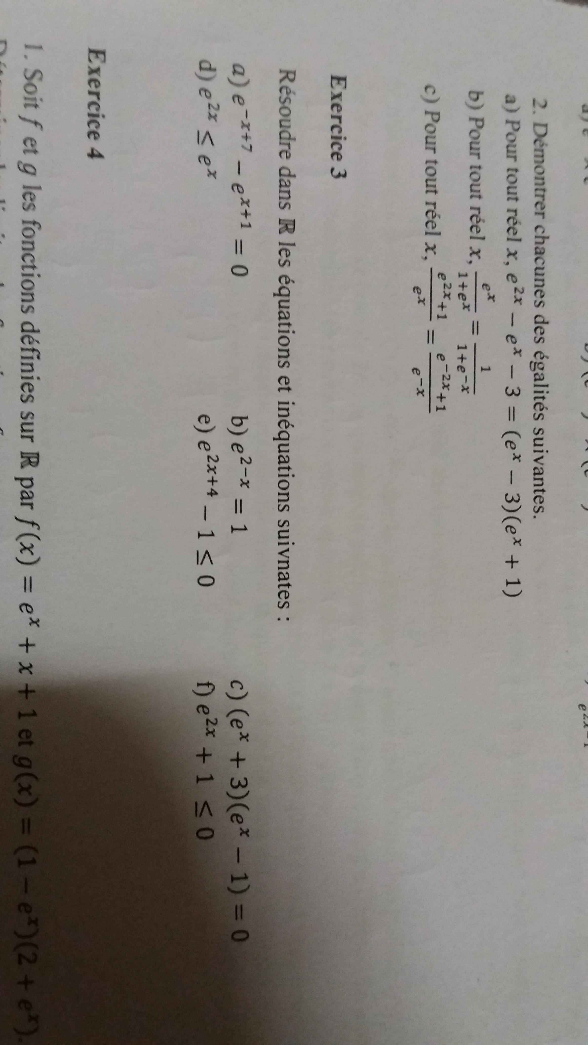E-Bahut pzorba75 Posté(e) le 6 novembre 2018 E-Bahut Signaler Posté(e) le 6 novembre 2018 Apprends à taper tes sujets au clavier, ils seront lisibles par tous et serviront pour te répondre. Par exemple e-x+7-ex+1=0 devient e7/ex-e*ex=0 en posant ex=X, il suffit de résoudre e7/X-eX=0 et terminer avec x=ln(X) (biensur X>0) Tout le reste se traite un peu de la même façon. À toi de te mettre au travail, pas de photo!