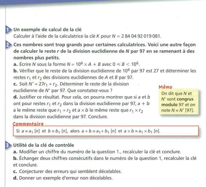 E-Bahut Barbidoux Posté(e) le 13 novembre 2018 E-Bahut Signaler Posté(e) le 13 novembre 2018 1——————— Exemple On peut en déduire que lorsque l’on interverti deux chiffres consécutifs et que la propriété du code barre reste vérifiée l’erreur ne peut être détectée. Par exemple 3*8+3=27=7 mod(10) et 3*3+8=17=7 mod(10) 2——————— Détermination de la clef de contrôle d’un code barre Code barre différent ayant la même clef de contrôle, il suffit de permuter deux chiffres de rang pair ou impair du code à l’exception de la clef de contrôle 3——————— Si la propriété est vérifiée pour le code C=a1a2a3a4a5a6a7a8a9a10a11a12a13 elle ne peut l’être pour un autre code ayant un seul chiffre aj différent du chiffre ai du code C car l’égalité ai mod (10)=aj mod(10) n’a pas de solution donc la propriété ne peut être simultanément satisfaite pour ces deux codes. En conclusion dans le cas ou seul un chiffre est erroné l’erreur est détectée. ——————— Si deux chiffres hors clef de contrôle, sont intervertis l’erreur ne sera pas forcément détectée si la propriété reste vérifiée autrement dit si ai+3*ai+1 mod(10)=3*ai+ai+1 mod(10) voir par exemple les codes C et C3. Dans tous les autres cas l’erreur sera détectée 4——————— Chiffre effacé