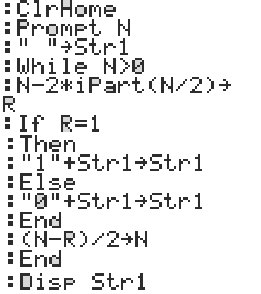 E-Bahut julesx Posté(e) le 18 novembre 2018 E-Bahut Signaler Posté(e) le 18 novembre 2018 Je n'ai pas de mérite, c'est juste une adaptation d'un algorithme trouvé sur la toile ! Par contre, sur ma calculette, il a fallu mettre un espace pour initialiser la "Str1", sans ce dernier, donc avec """"->Str1, j'avais un message de dimension invalide lors du premier essai d'ajout de "0" ou de "1".