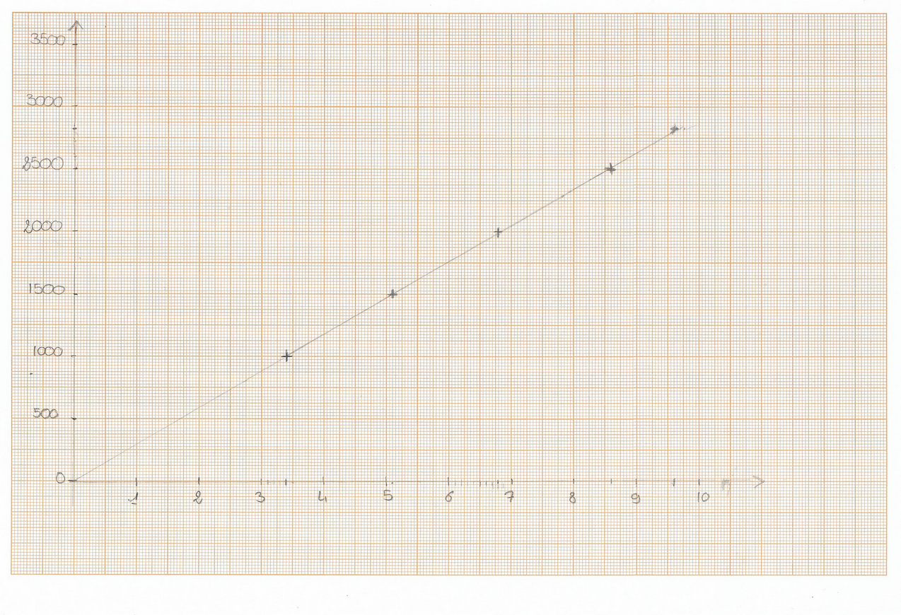 E-Bahut julesx Posté(e) le 25 novembre 2018 E-Bahut Signaler Posté(e) le 25 novembre 2018 Tu aurais dû donner suite tout de suite après. Ainsi, j'aurais pu voir comment tu as interprété ma réponse et j'aurais pu "rectifier le tir" si nécessaire. Voilà ce que je voulais que tu fasses : * Commencer par calculer les inverses de λmen m-1 (pour tracer la courbe, le mieux était de regrouper les résultats sous forme d'une série de coordonnées). En arrondissant à 2 chiffres après la virgule et en notation scientifique, il vient (3,45*105;1000) (5,13*105;1500) (6,90*105;2000) (8,62*105; 2500) (9,62*105;2800) * Ensuite, reporter les points dans un graphique avec, par exemple, comme échelle, 1 cm = 105 m-1 et 1 cm = 500° et regarder si on peut y faire passer une droite passant par l'origine (voir pièce jointe, en ordonnée, j'ai un peu dilaté l'échelle). Comme c'est le cas, il ne te reste plus qu'à en déduire la pente A et voir si tu obtiens une valeur compatible avec celle que donne la loi de Wien.