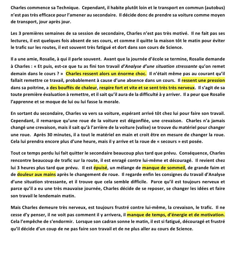 tulip12 Posté(e) le 16 décembre 2018 Auteur Signaler Posté(e) le 16 décembre 2018 il y a une heure, chloém a dit : En effet, tu avais bien mis le texte. Ce qui dépend de Charles, par exemple: lire ses textes, suivre ses cours, s'organiser pour dormir suffisamment... Ce qui ne dépend pas de lui, par exemple: le fait d'habiter loin, la crevaison... Bon travail pour la suite. Comment je fais pour savoir si la situation est contrôlable ou non, imprévisible ou non, nouvelle ou non et ego menacé ou non