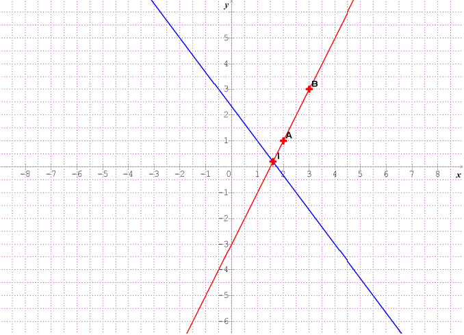 Shadowless Posté(e) le 15 décembre 2018 Signaler Posté(e) le 15 décembre 2018 Bonsoir, Je suis entrain de faire un exercice en math mais je suis bloquée à une question. Voici mon énoncé : Le plan est rapporté à un repère quelconque (O ; i ; j). On considère les points A(2;1) , B(3;3) et la droite d dont un équation cartésienne est 4x + 3y – 7 = 0. Déterminer une équation cartesienne de la droite (AB) Les droites d et (AB) sont – elles parallèles ou sécantes . Justifier. Déterminer par le calcul les coordonnées du point d’intersection d et (AB). Tracer ces deux droites et contrôler le résultat de la question précédente J'ai déjà répondu au deux premières questions c'est la troisième question qui me pose problème. Pouvez-vous m'aider ? Voici mes réponses aux premières questions : 1. La droite (AB) a pour vecteur directeur AB (xb -xa ; yb – ya) soit AB (1;2). Or selon le troisième théorème, les coordonnées d’un vecteur directeur sont (-b ; a). On a donc -b = 1 et a = 2 soit a = 2 et b = -1. Une équation cartésienne de la droite (AB) est donc de la forme 2x – 1y + c = 0 soit 2x – y + c = 0. Pour déterminer le coefficient c , on utilise les coordonnées d’un point de la droite , par exemple le point A. A(2;1) appartient à la droite (AB) donc 2*2 – 1 + c = 0 d’où 4 – 1 + c = 0 soit c = -3. Une équation cartésienne de (AB) est donc 4 x – y + (-3) = 0 d’où 2x – y – 3 = 0. 2. Elles sont sécantes (J'ai justifier en montrant que les vecteurs directeurs ne sont pas colinéaires). 3. Je ne sais pas comment m'y prendre. Merci en avance de votre aide.