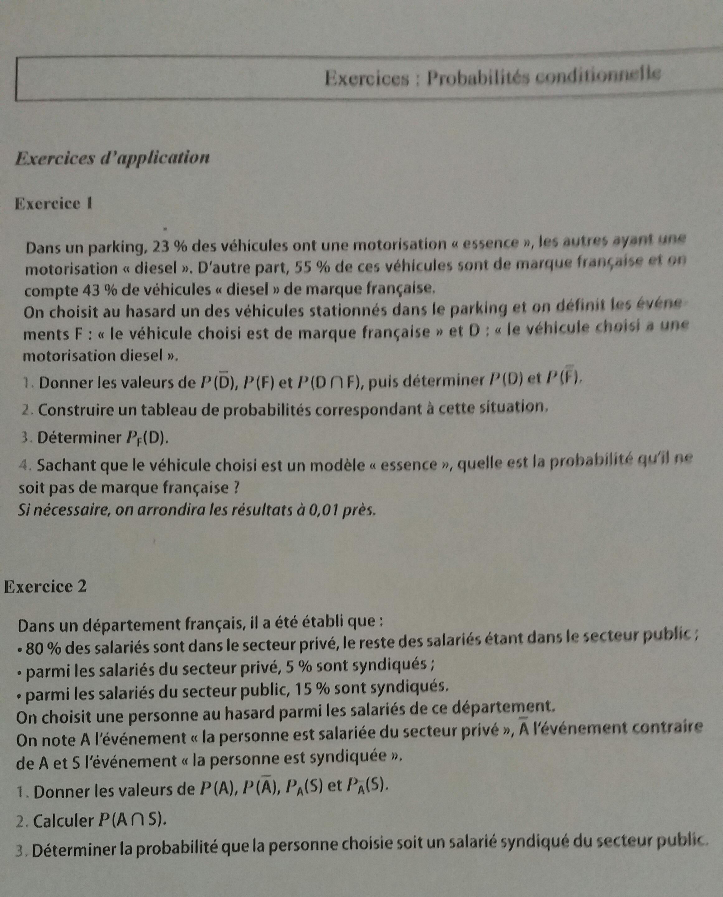 E-Bahut PAVE Posté(e) le 17 décembre 2018 E-Bahut Signaler Posté(e) le 17 décembre 2018 Bonsoir mon ami , Oui bien sûr que nous pouvons t'aider... enfin on peut essayer !! Dans ton cours, ton prof a du te donner des exemples, des formules (?), des méthodes... as tu essayé de les mettre en oeuvre ? montre nous ce que tu as fait pour que l'on puisse voir où se situent tes difficultés. Tableau (de contingence) ou arbre ? que vous a montré le prof ?? Tu as bien réussi à mettre ton énoncé en pièce jointe donc tu devrais sans trop de difficultés nous montrer comment tu fais un tableau ou un arbre avec les données de l'exercice 1.... Allez essaye. Nous sommes à ton écoute
