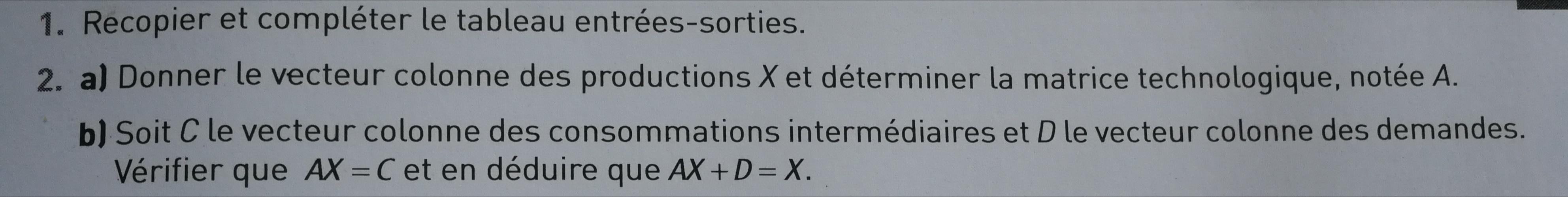 E-Bahut julesx Posté(e) le 20 décembre 2018 E-Bahut Signaler Posté(e) le 20 décembre 2018 Comme dit dans l'énoncé, X est le vecteur colonne des productions. Sur ton tableau, tu vois que les productions sont dans la dernière colonne, il s'agit donc bien de là où il i y a x et y, soit X= 50 25 Mais ta matrice A est fausse, il faut calculer les fractions par rapport à la production, pas par rapport aux consommations intermédiaires. Il y a aussi une erreur au niveau des différents calculs a11=5/50=1/10 a12=10/25=2/5 a21=2/50=1/25 a22=5/25=1/5 N.B.1 : Comme tu pars d'un tableau de valeurs, le calcul dépend de X, mais la matrice A que tu obtiens est une matrice supposée constante quelle que soit ensuite la production. N.B.2 : Si tu multiplies A par X, tu dois retrouver le vecteur colonne des consommations intermédiaires totales.