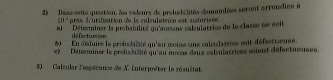 E-Bahut Barbidoux Posté(e) le 31 décembre 2018 E-Bahut Signaler Posté(e) le 31 décembre 2018 Lorsqu'on s'intéresse à un événement qui n’a que deux issues, ce qui est le cas ici (machine défectueuse ou non) la réalisation de l'expérience est appelée épreuve de Bernoulli. Par définition la variable aléatoire X qui désigne le nombre de succès de probabilité commune p qui vaut ici 0.02 dans un schéma de Bernoulli suit une loi binomiale de paramètres n=34 et p, notée B(34,0.02) 2a——————— P(X=0)= 0.98^34=0.5031=50.31% 2b——————— P(X≥1)=1-P(X=0)=0.4969=49.69% 2b——————— P(X≥2)=1-P(X=0)-P(X=1)=1-0.5031-(34,1)*0.98^33*0.02=1-0.5031-34*0.98^33*0.02=0.1477=14.78% 3——————————— E(X)=n*P=34*0.02=0.68 Il ya aura au plus 1 machine défectueuse sur le lot acheté